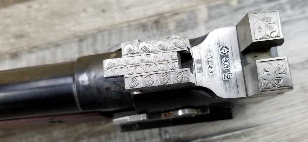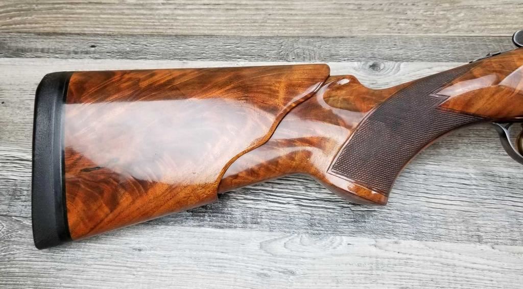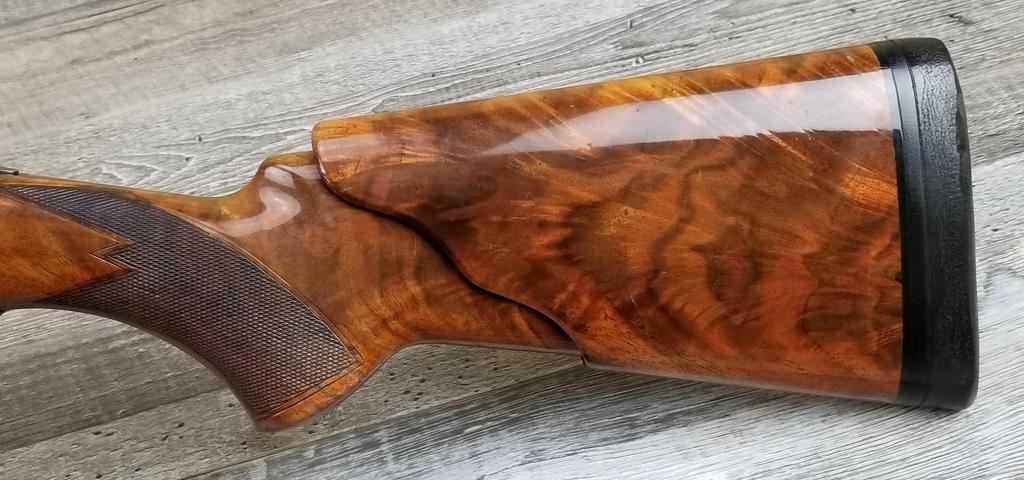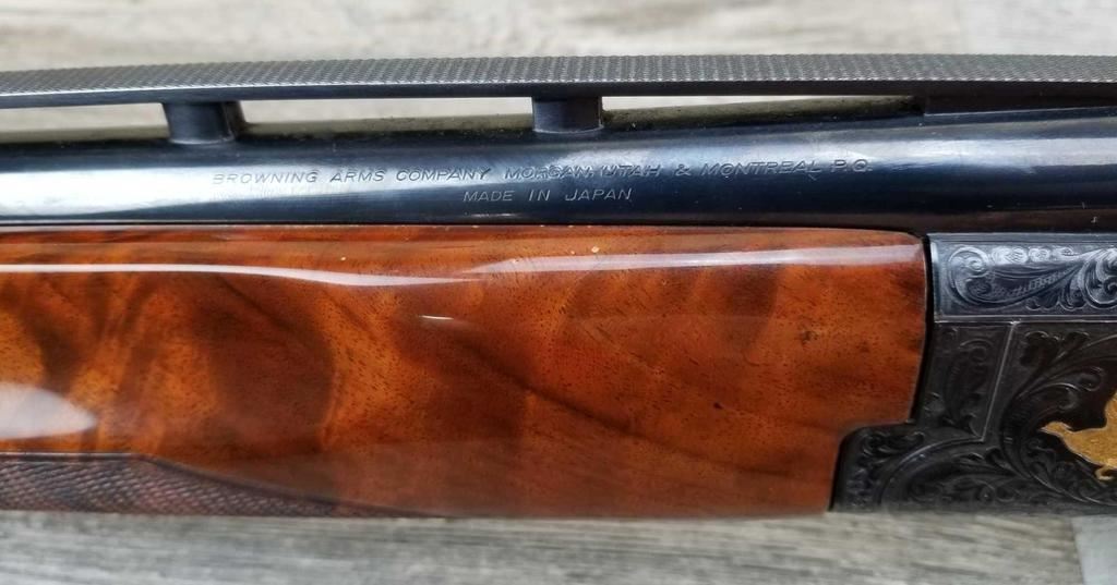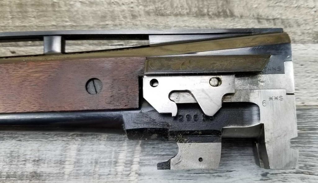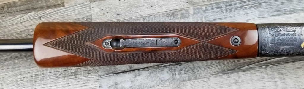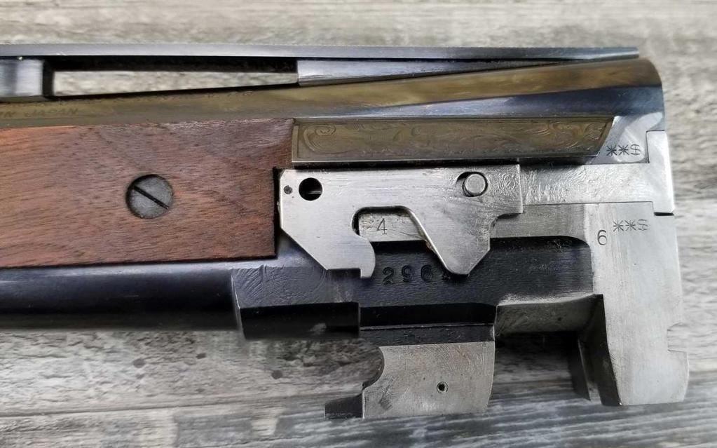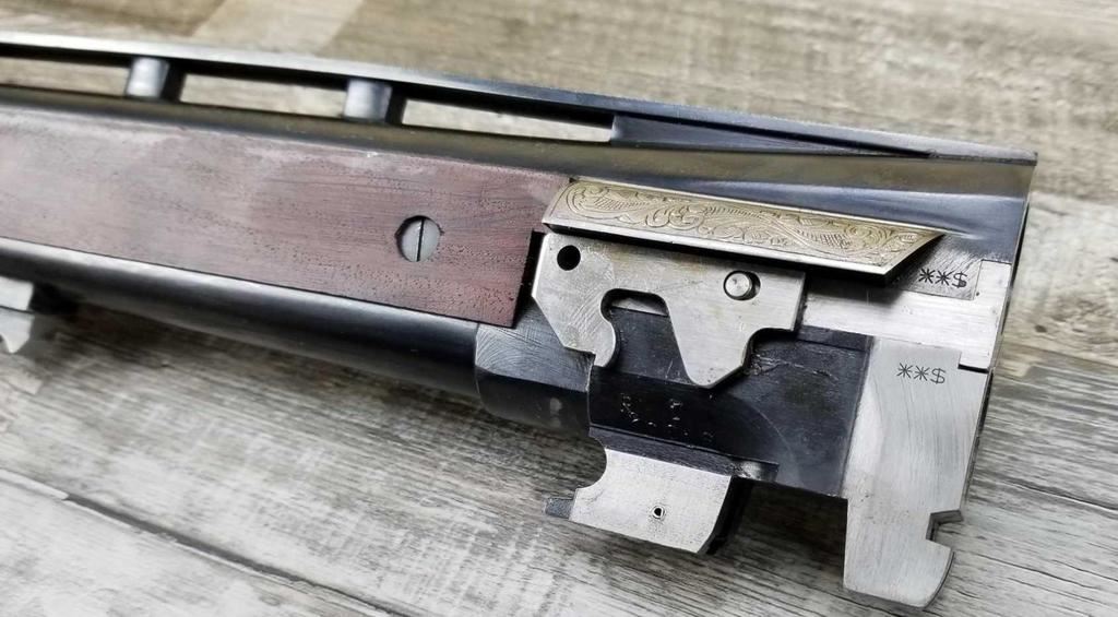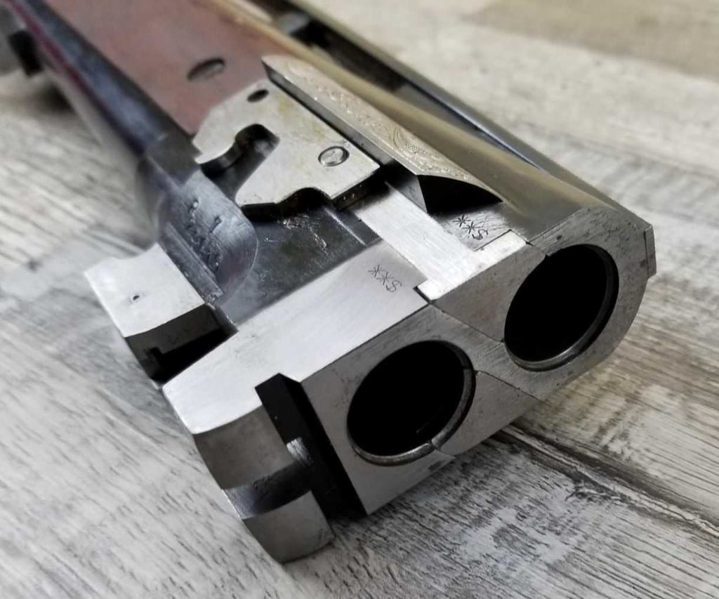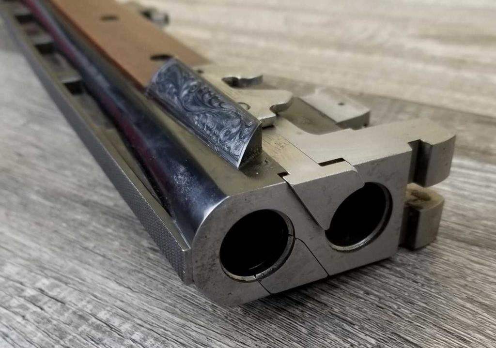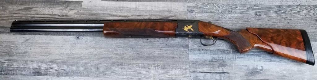 FACTORY ENGRAVED. WITH GOLD INLAYED BIRDS ON PANELS AND TRIGGER GUARD, WITH GOLD INLAYED DOG ON BOTTOM OF RECEIVER. SHOCK ABSORBER STOCK. LOP 13.5in. LOSS OF BLUE TO LOWER TANG. BRIGHT SHINY BORES, ON ALL FOUR SETS.