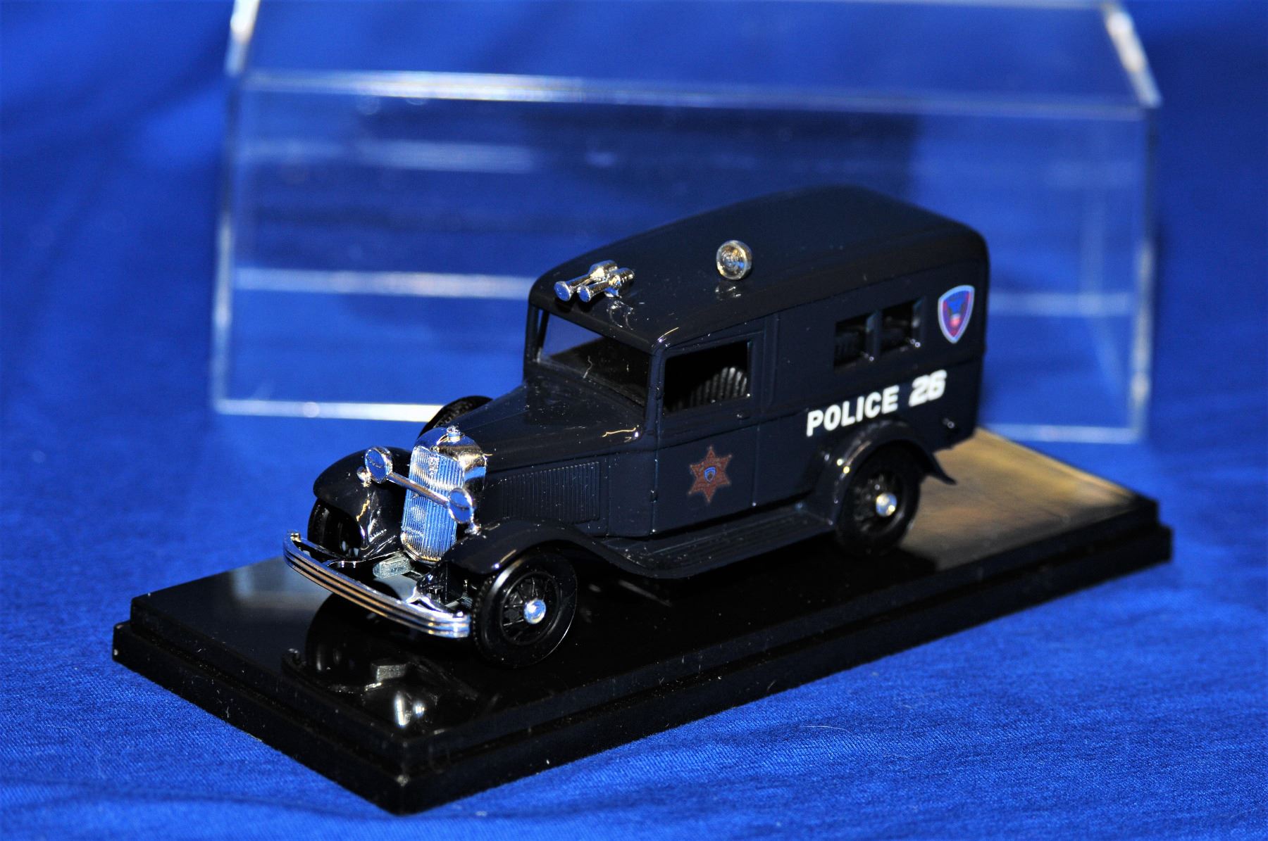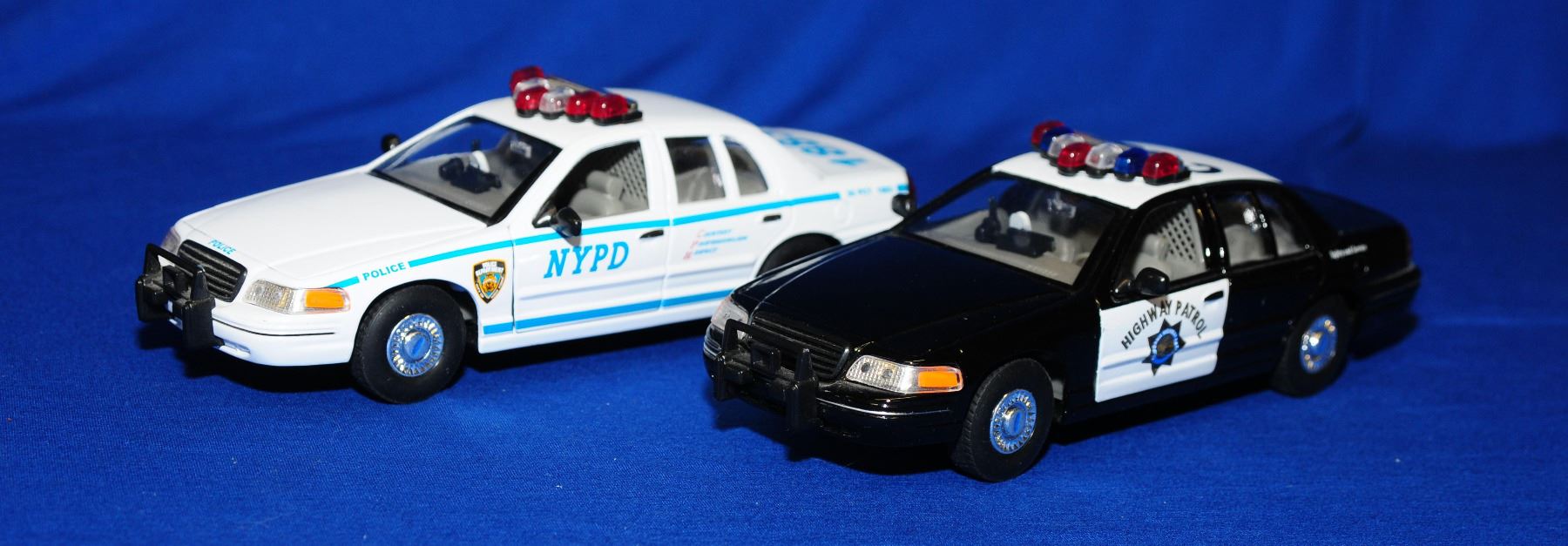 1) Welley 1:24 scale 1999 Ford Crown Vic NYPD Police car 2) Welley 1:24 scale 1999 Ford Crown Vic California Highway Patrol car 3) 1:43 scale 1932 Ford Police panel wagon with display case 4) Tootsietoy Chevrolet Corvette with display case