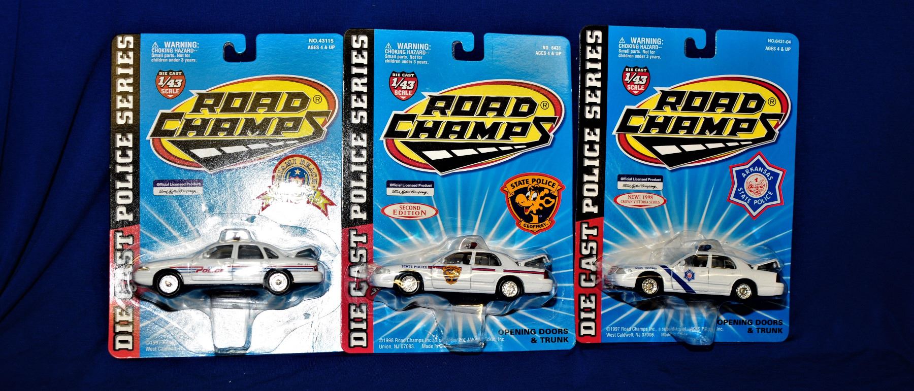 6 law enforcement cars 1) Crown Vic Arkansas State Police 2) Crown Vic State Police Geoffrey 3) Crown Vic Miami Beach PD 4) Crown Vic Bismarck PD 5) Crown Vic Ramah Navajo PD 6) Crown Vic Olympia PD
