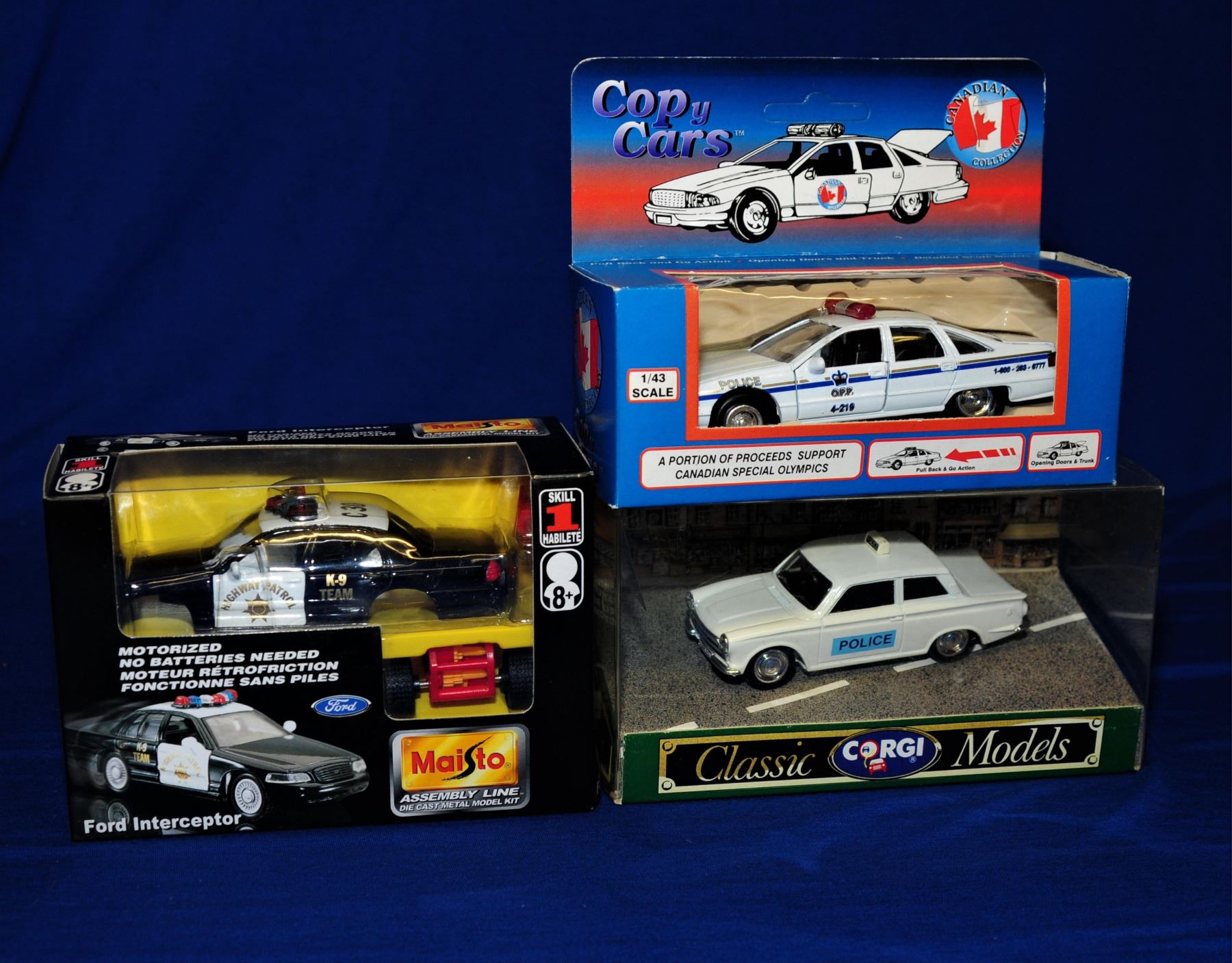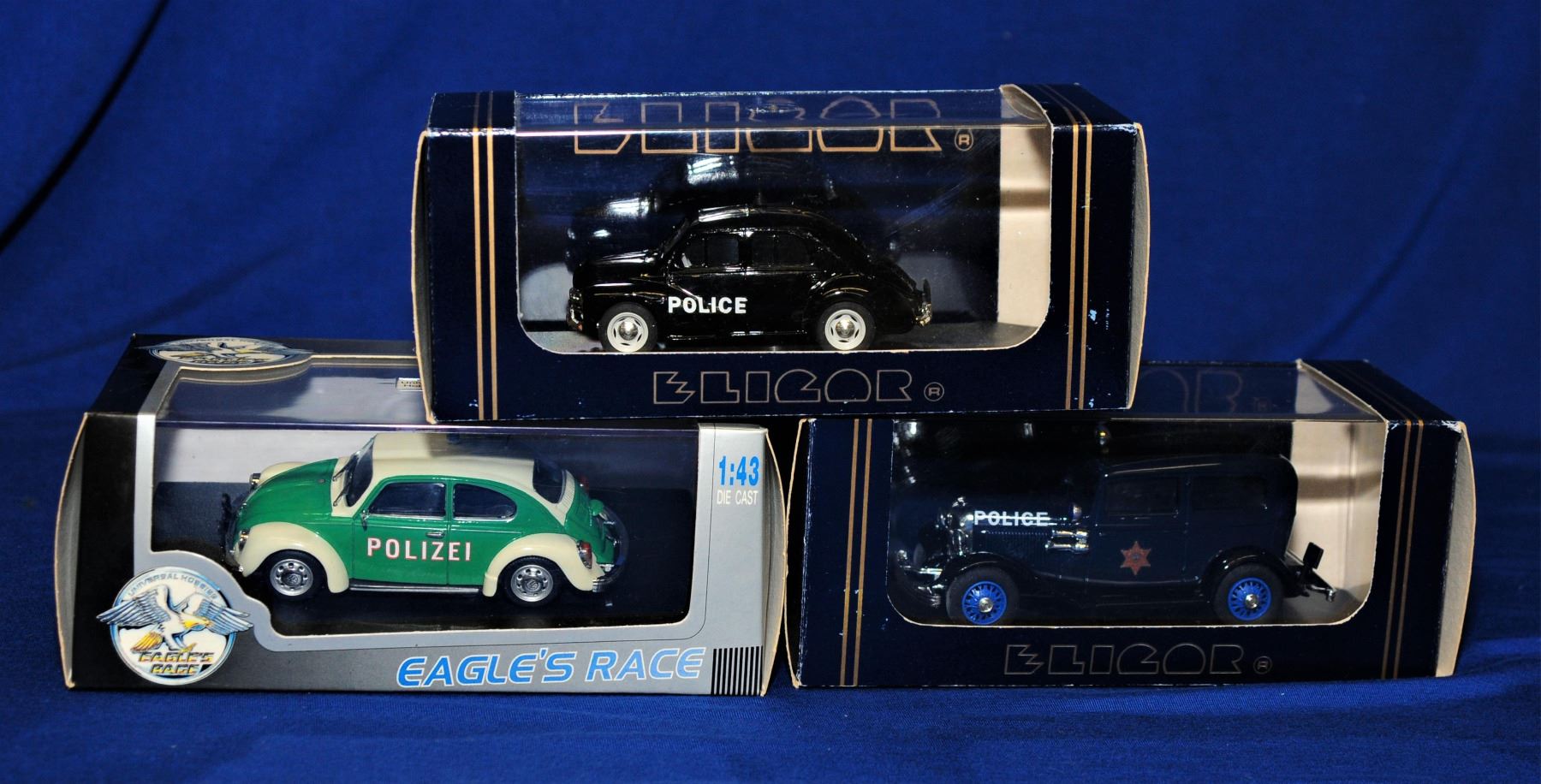 1:43 scale 1) Eligor Renault 4 CV 1954 Police car 2) Eligor 1932 Ford Tudor Police car 3) Corgi D708 Ford Cortina Saloon police car 4) Copy Cars Chevy caprice OPP car 5) Eagles Race Volkswagen Police car 6) Maisto Ford Interceptor Police car