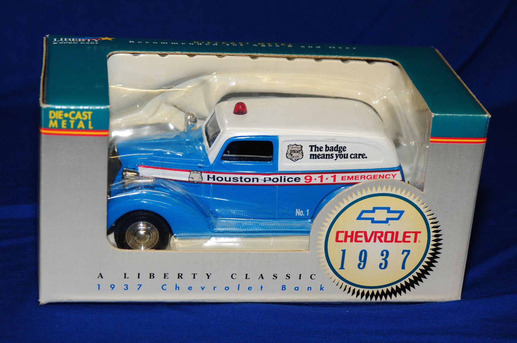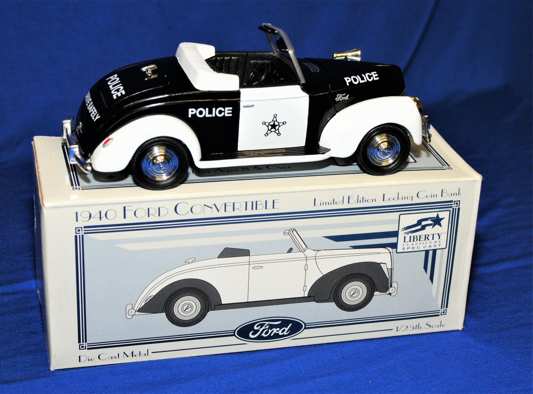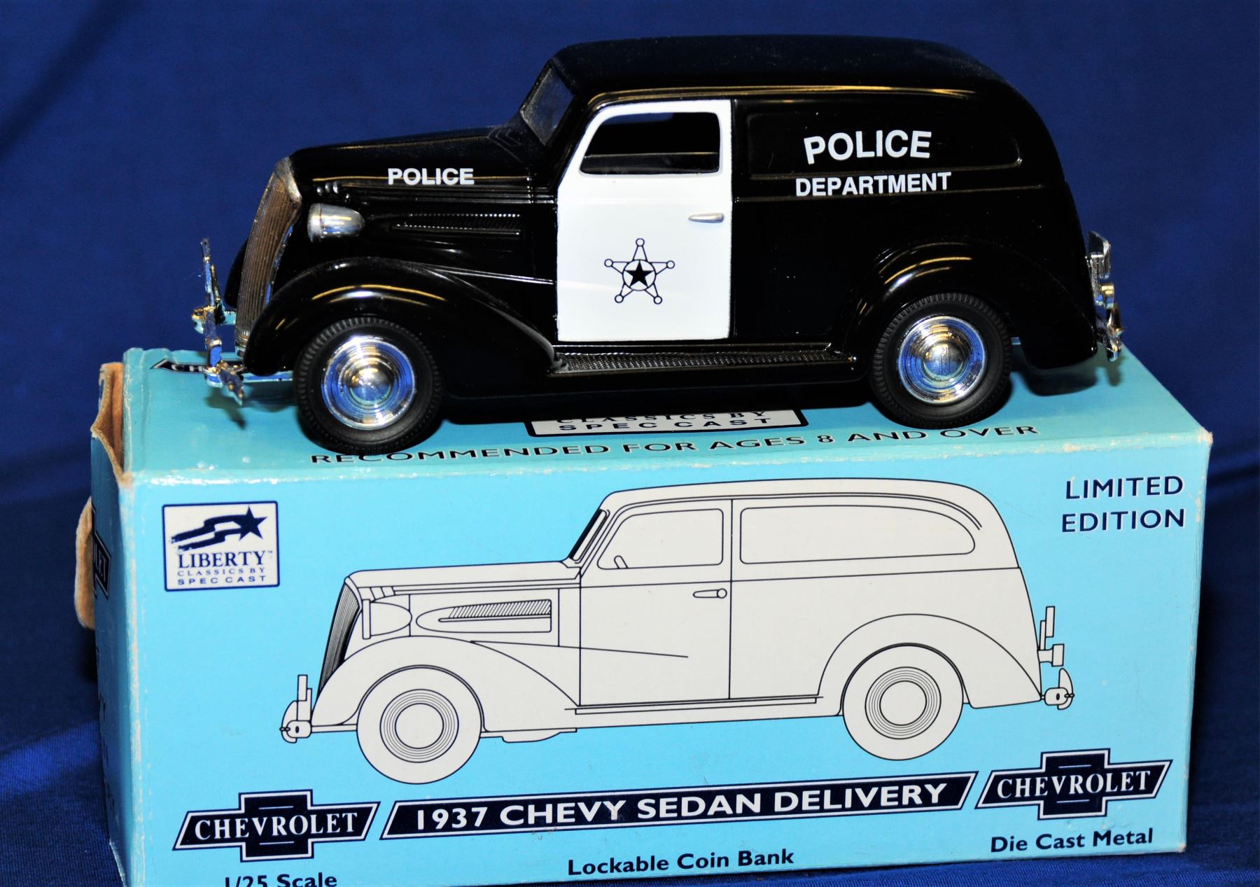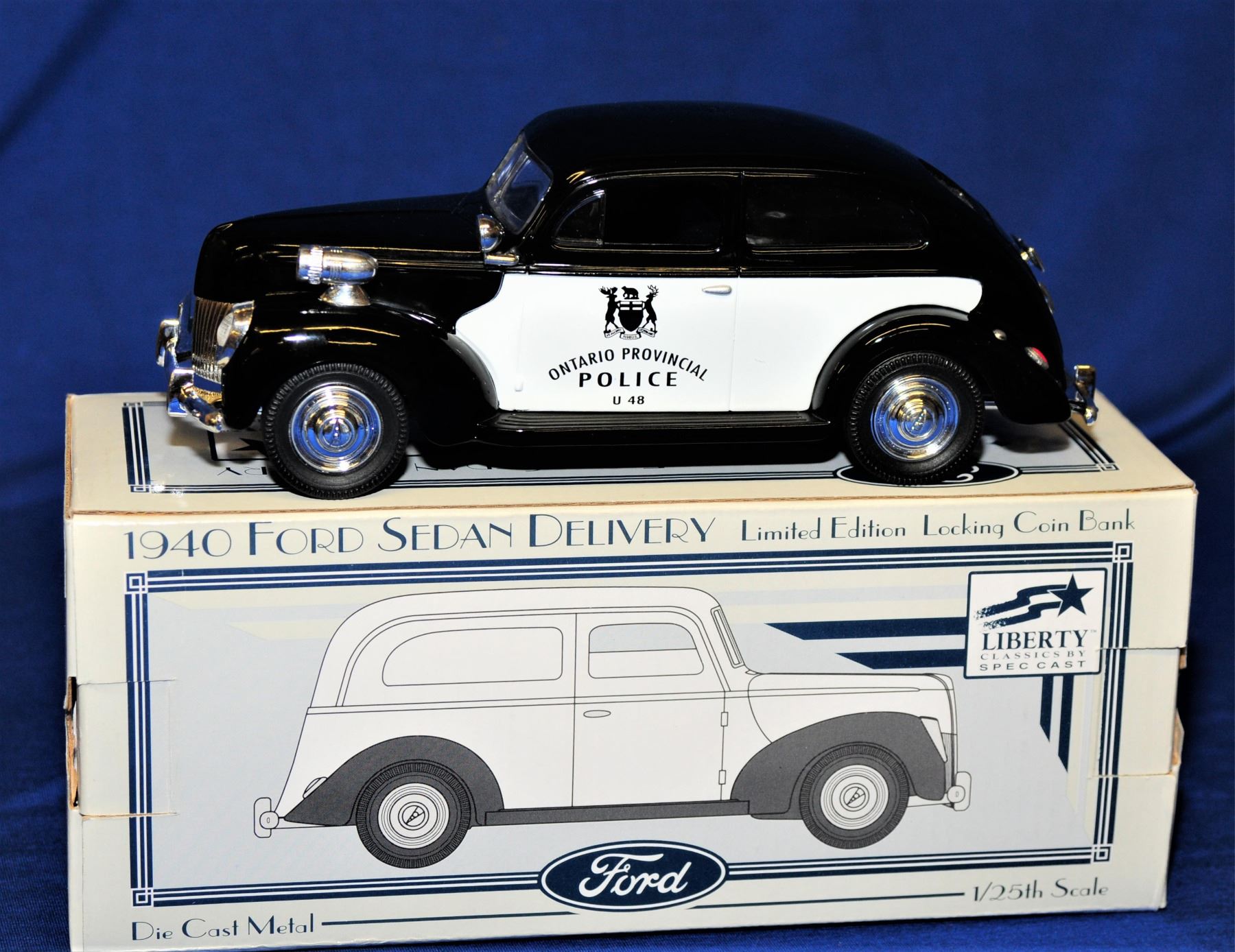 1:25 scale all by Liberty Classics and all as new in original boxes 1) 1940 Ford Sedan Delivery lockable coin bank 2) 1940 Ford Convertible lockable coin bank 3) 1937 Chevy Sedan Delivery lockable coin bank 4) 1937 Chevy Sedan Houston police coin bank