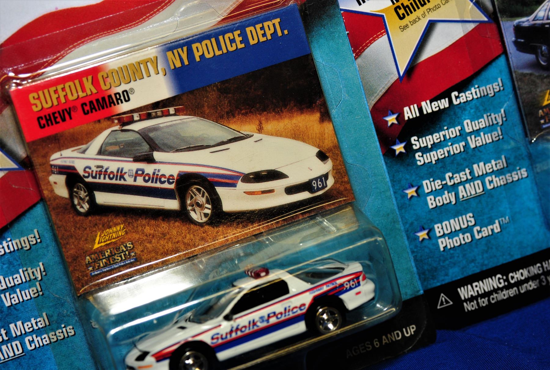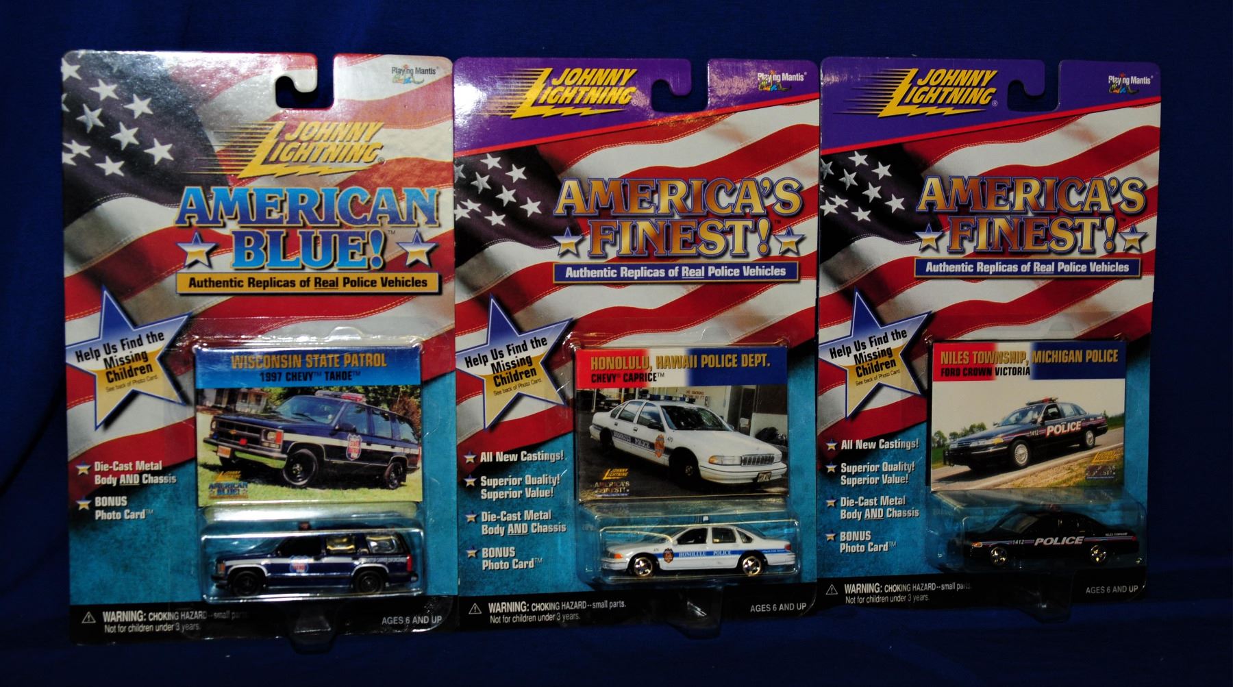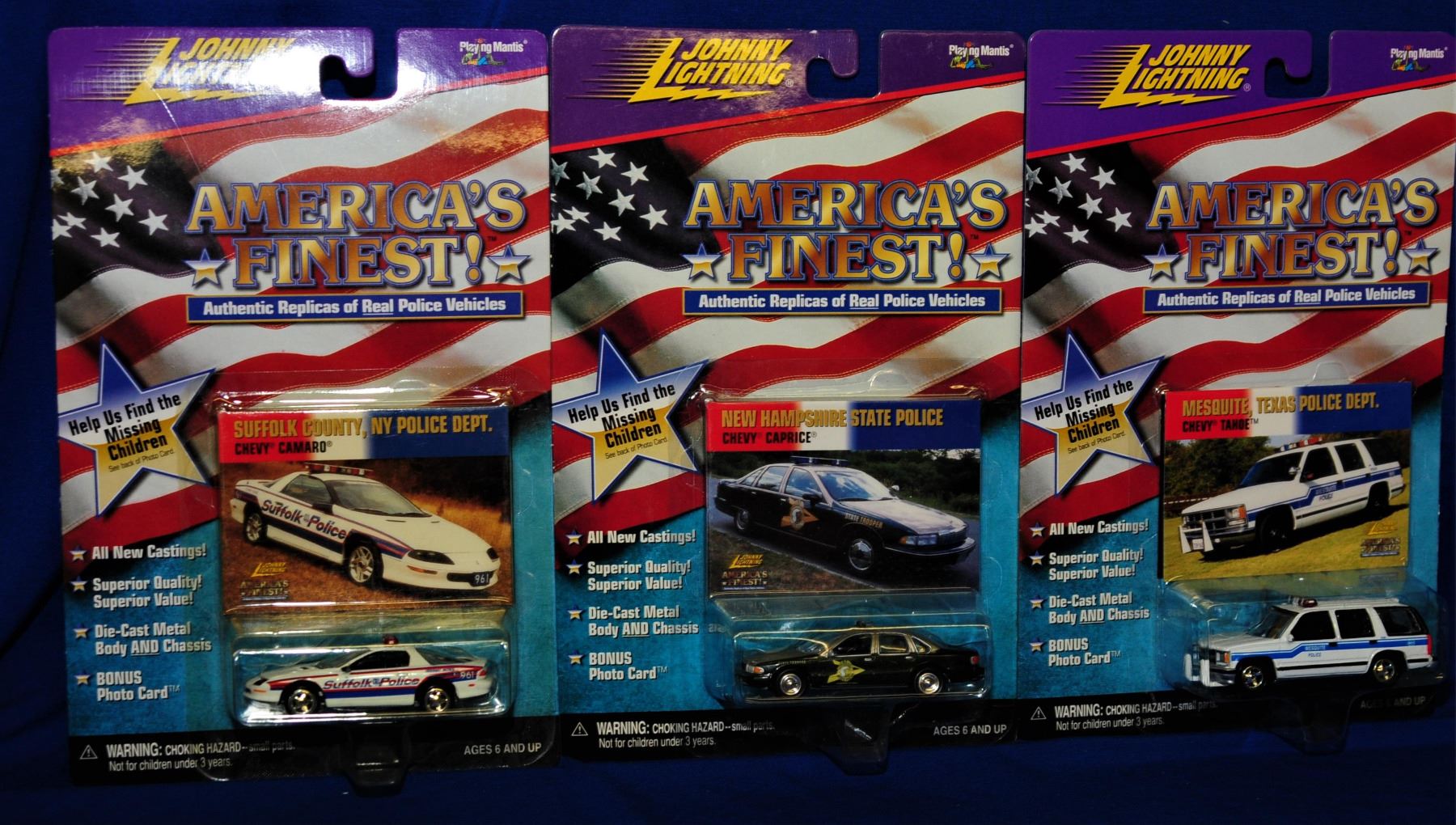 1:64 scale die cast 1) Chevy Tahoe Mesquite Police 2) Chevy Caprice New Hampshire Statae police 3) Chevy Camaro Suffolk County NY Police Dept. 4) Chevy Caprice Hawaii PD 5) 1997 Chevy Tahoe Wisconsin State Patrol 6) Crown Vic Niles Township, Michigan PD