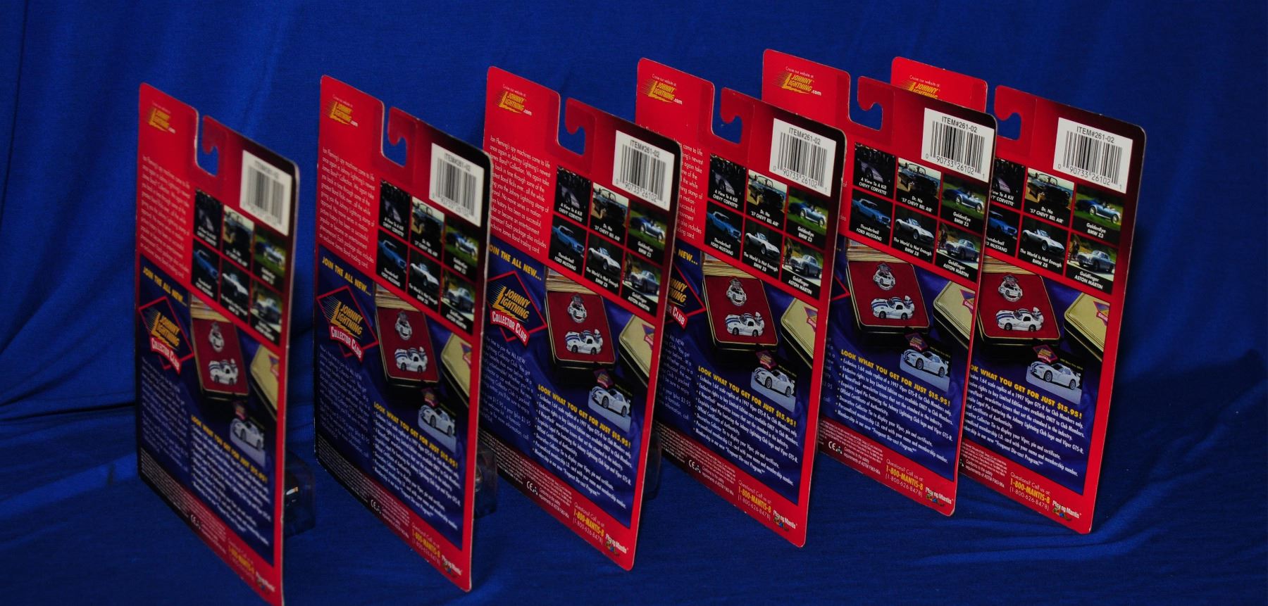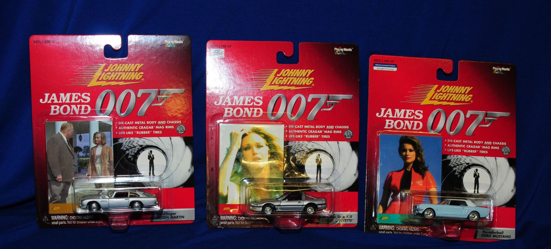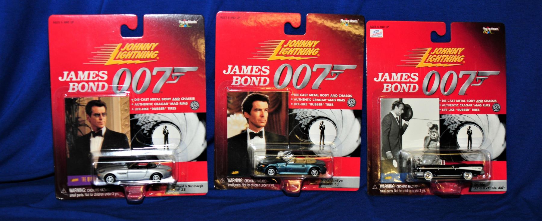 1:64 scale by Johnny Lightning 6 different cars 1) Chevy Corvette from A View to A Kill 2) Dr. No 57 Chevy Belair 3) BMW Z3 from GoldenEye 4) BMW Z* from The World is Not Enough 5) Ford Mustang from Thunderball 6) Aston Martin from Goldfinger