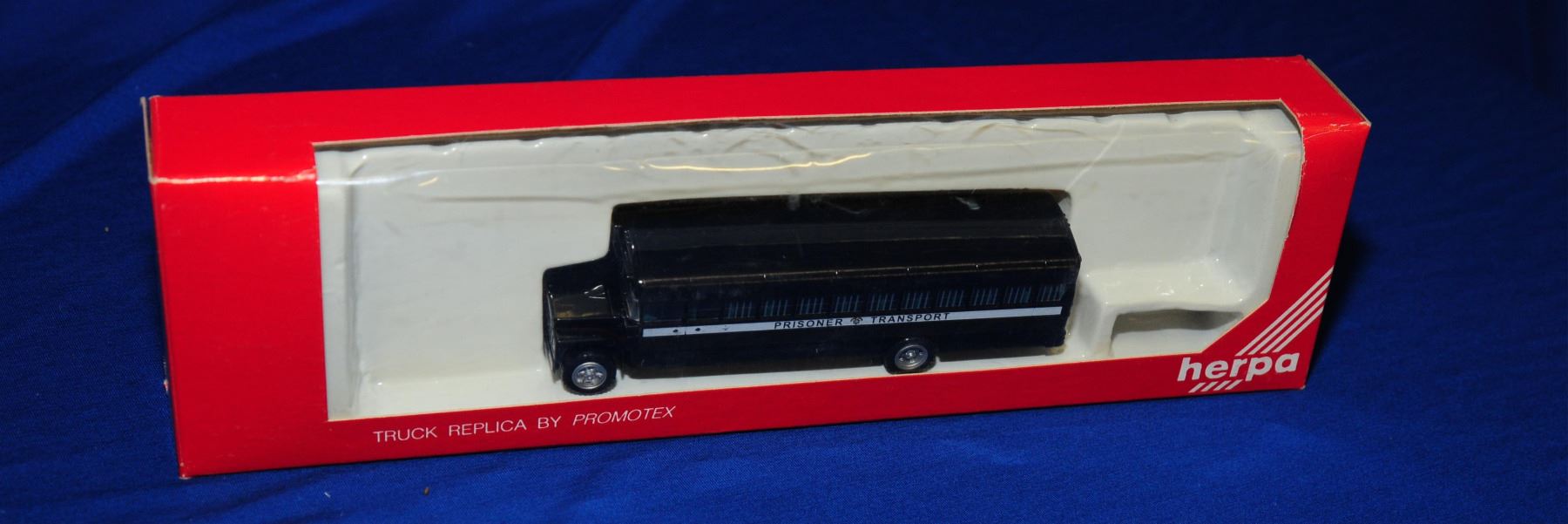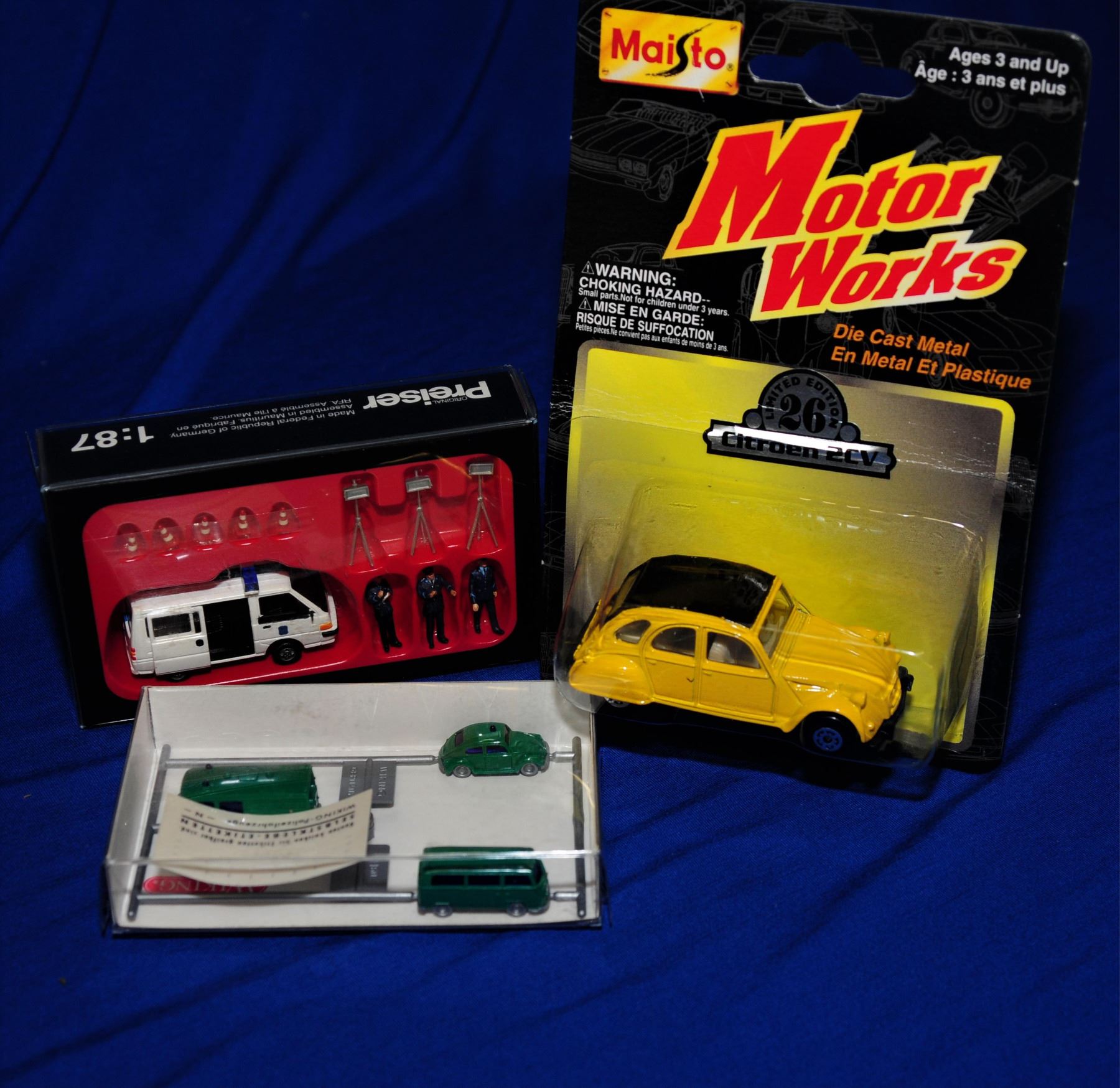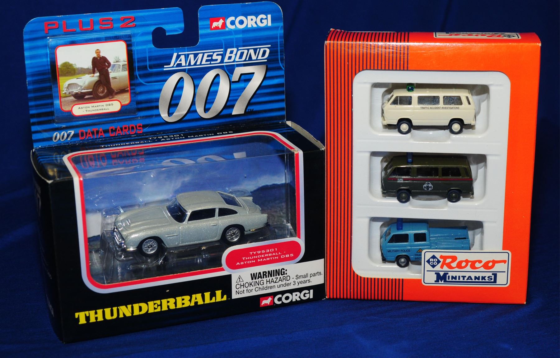 1) set of three miniatures 2) Mitsubishi L 300 Belgian Police van with accessories 3) set of three Roco miniature vans 4) Corgi James Bond Aston Martin DB5 5) Maisto Citroen 2CV 6) Prisoner Transport