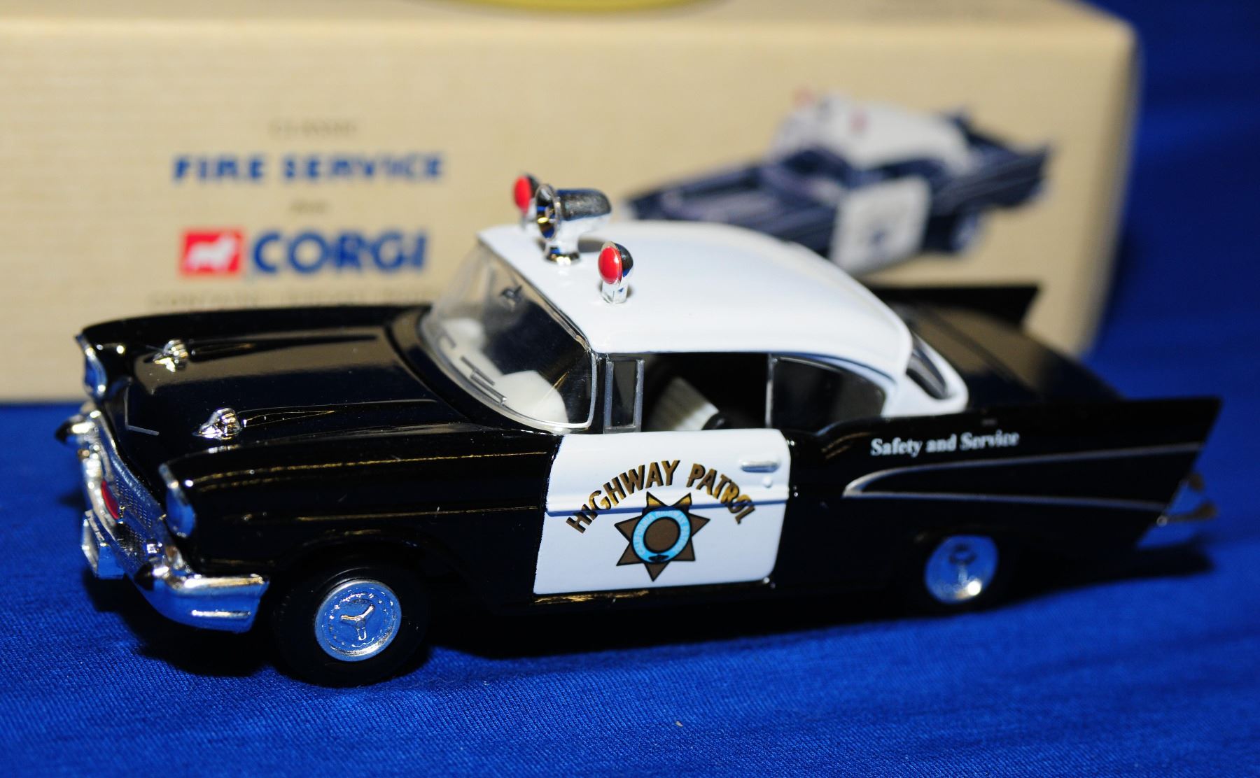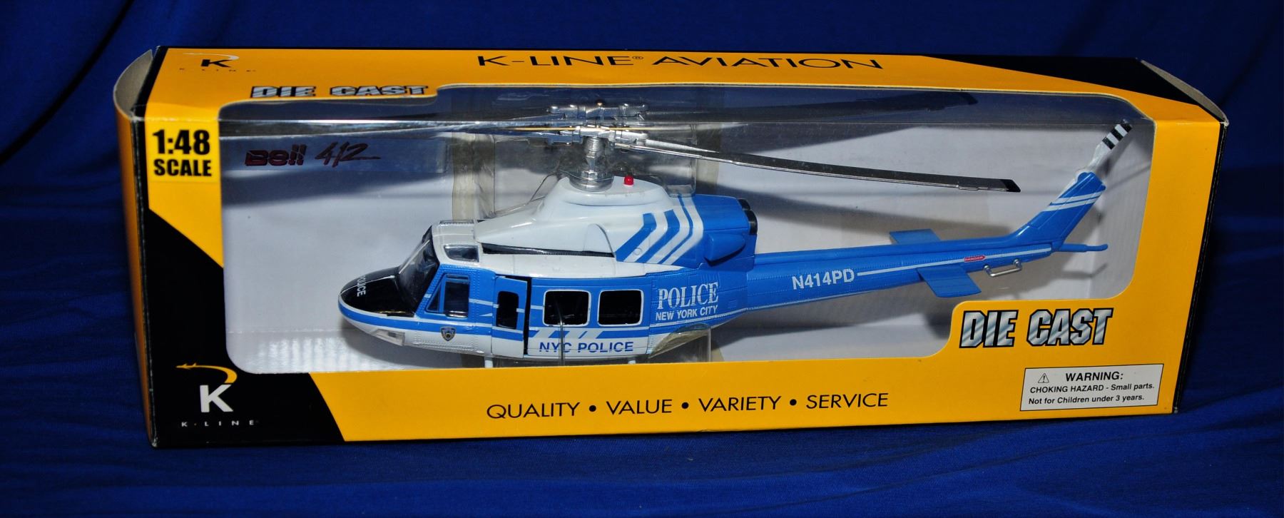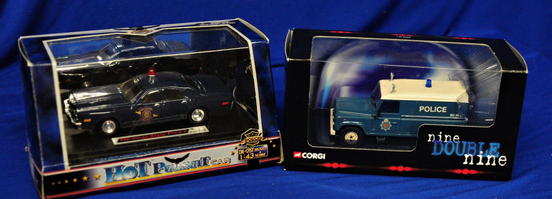 1) 1:43 scale Chevy Belair CHIP car 2) 1:43 scale Land Rover Defender Lancashire Constabulary 3) 1:43 scale 1978 Plymouth Fury Michigan State Police 4) 1:48 scale NYPD Bell 412 Hellicopter