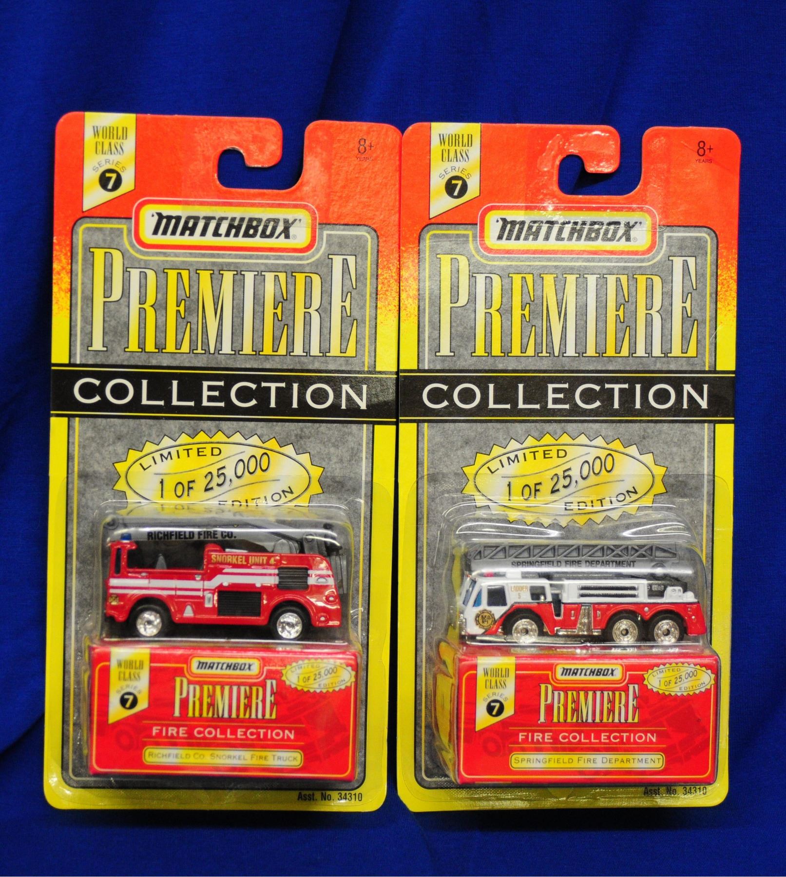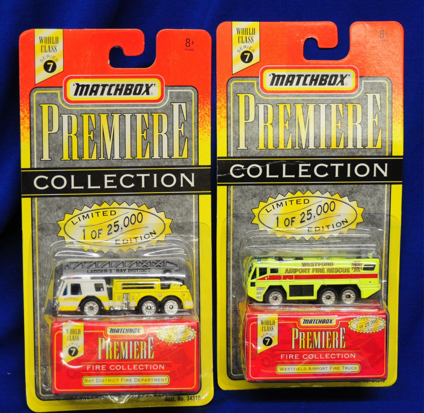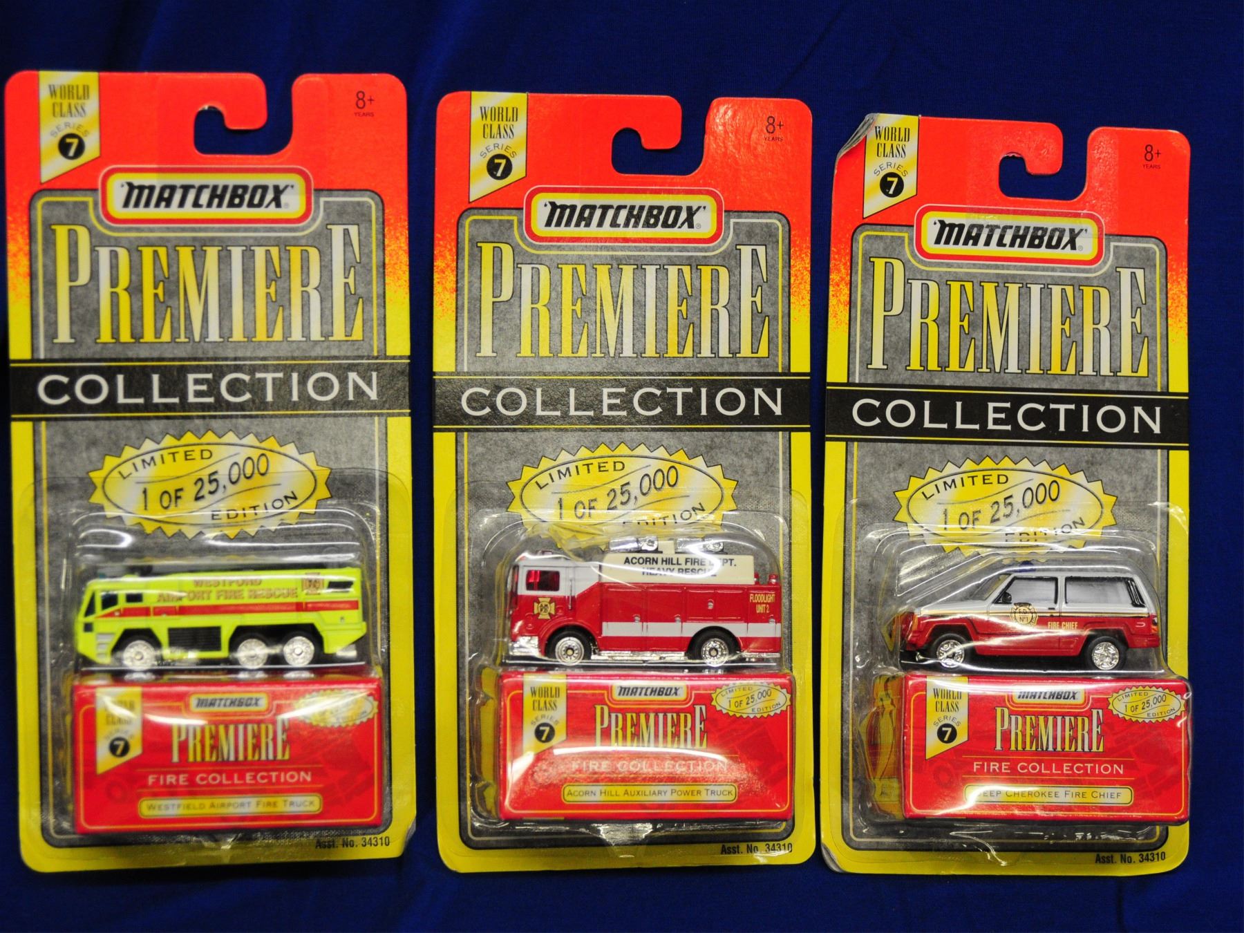 1:64 scale die cast 1) Springfield Fire Dept. 2) Bay District Fire Dept. 3) Westfield Airport Fire Truck 4) Acorn Hill Auxiliary Power Truck 5) Richfield Co. Snorkel Fire Truck 6) Jeep Cherokee Fire Chief 7) Westfield Airport Fire Truck all as new in original packages