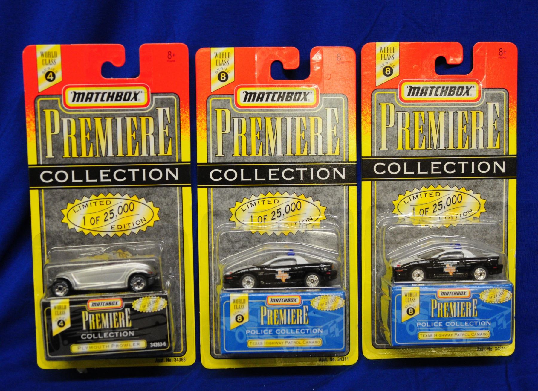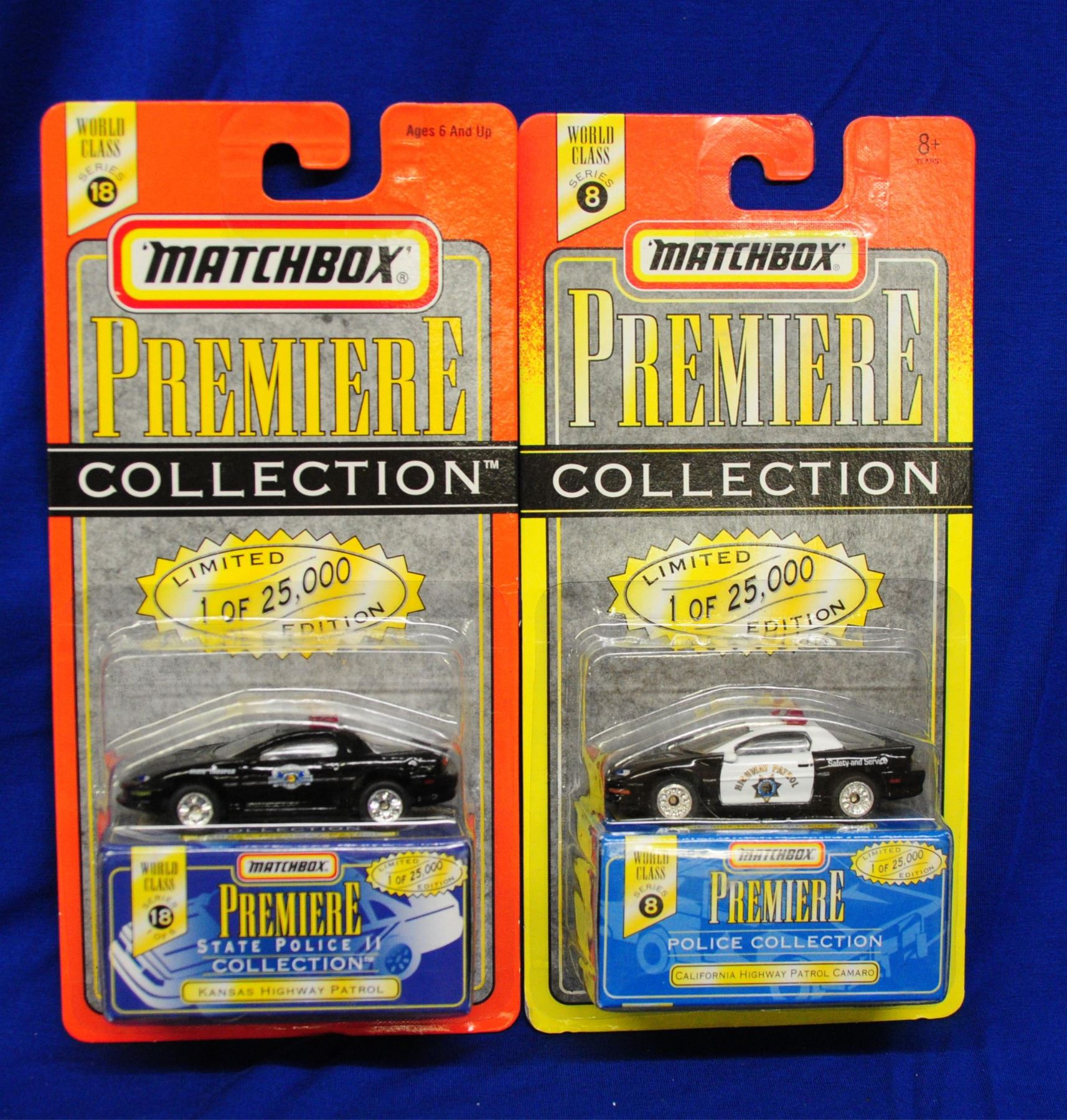 1:64 scale, 5 premiere collection and 5 various vehicles Premiere Collection 1) State Police 11 2) California Hwy. Patrol Camaro 3) Texas Hwy. Patrol Camaro 4) Plymouth Prowler 5) Texas Hwy. Patrol Camaro Various Vehicles 1) Snorkel Fire Engine 2) Armored Car 3) 6 wheel Police Smasher 4) Mobile Police 5) Fire Ladder Truck