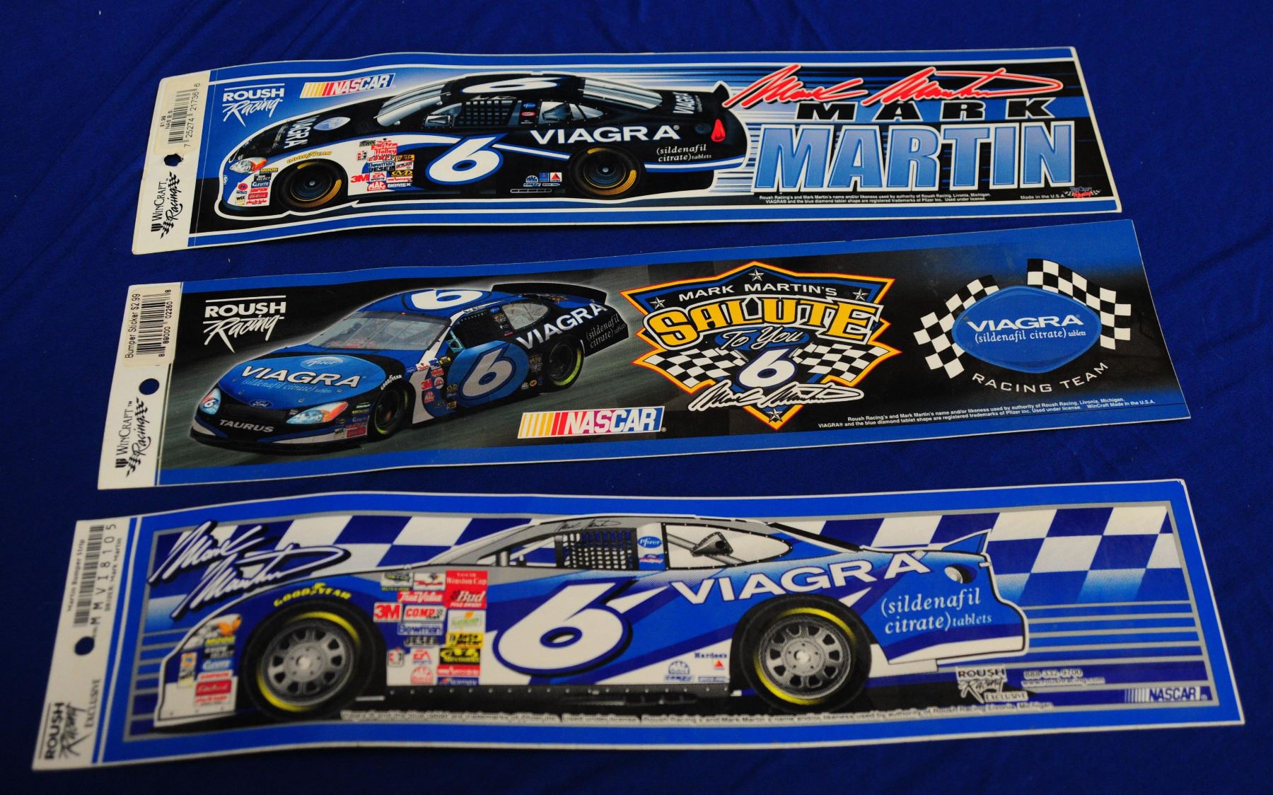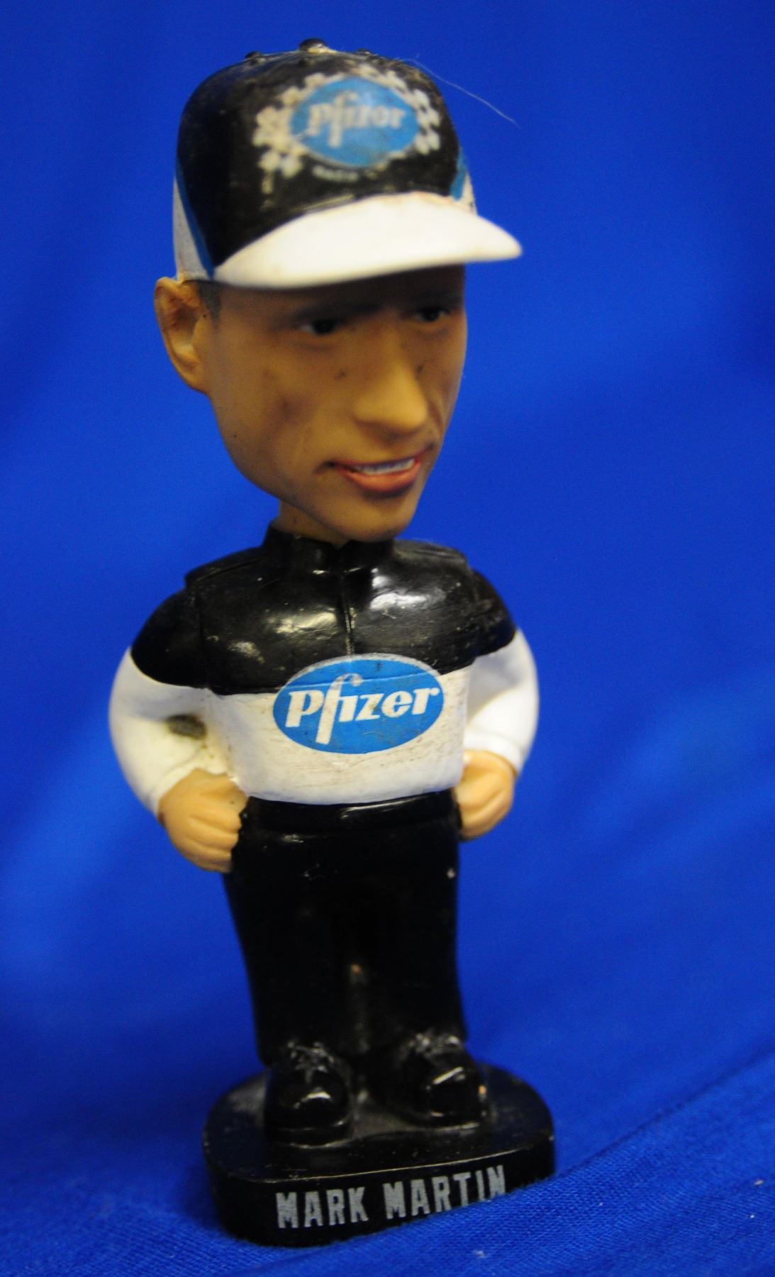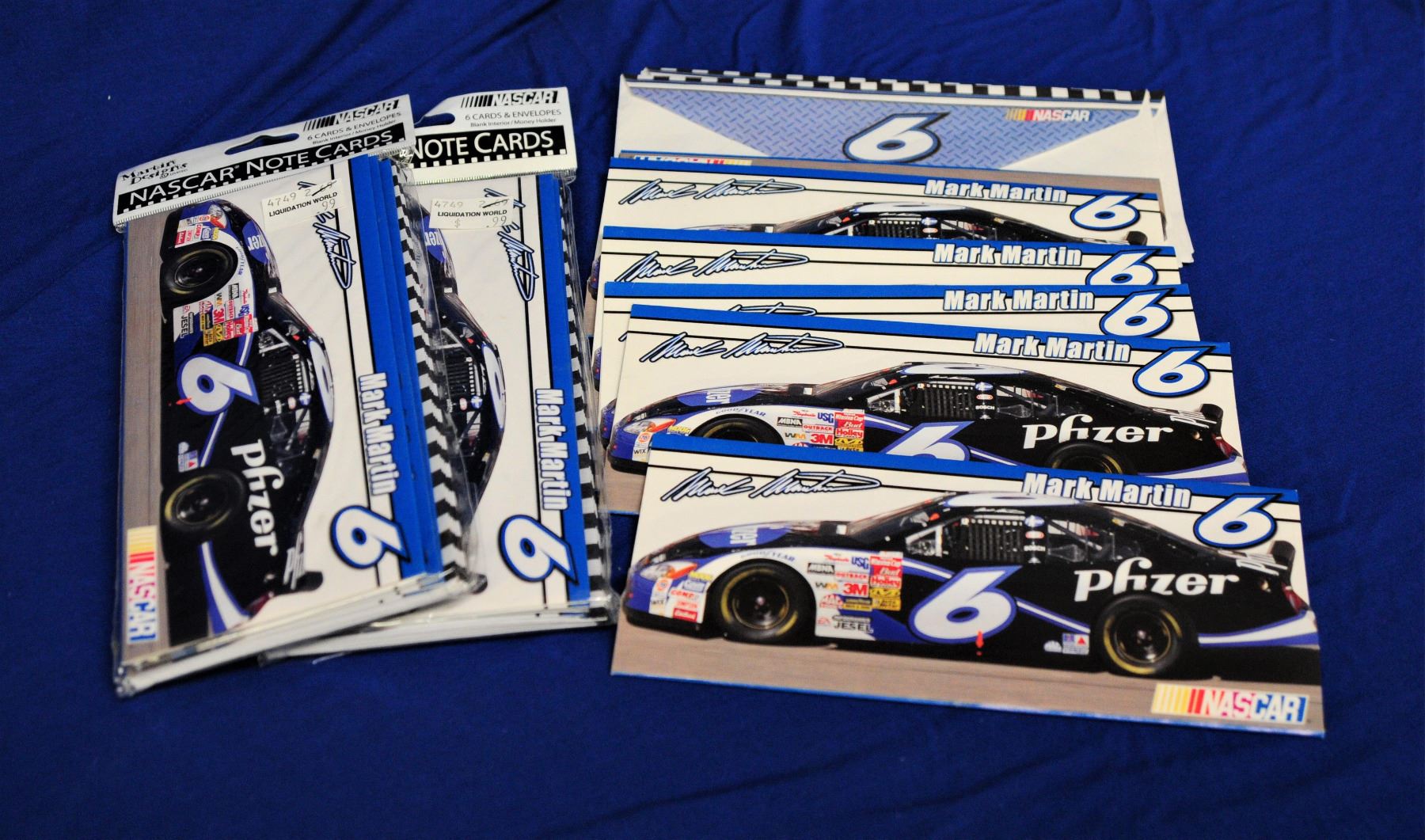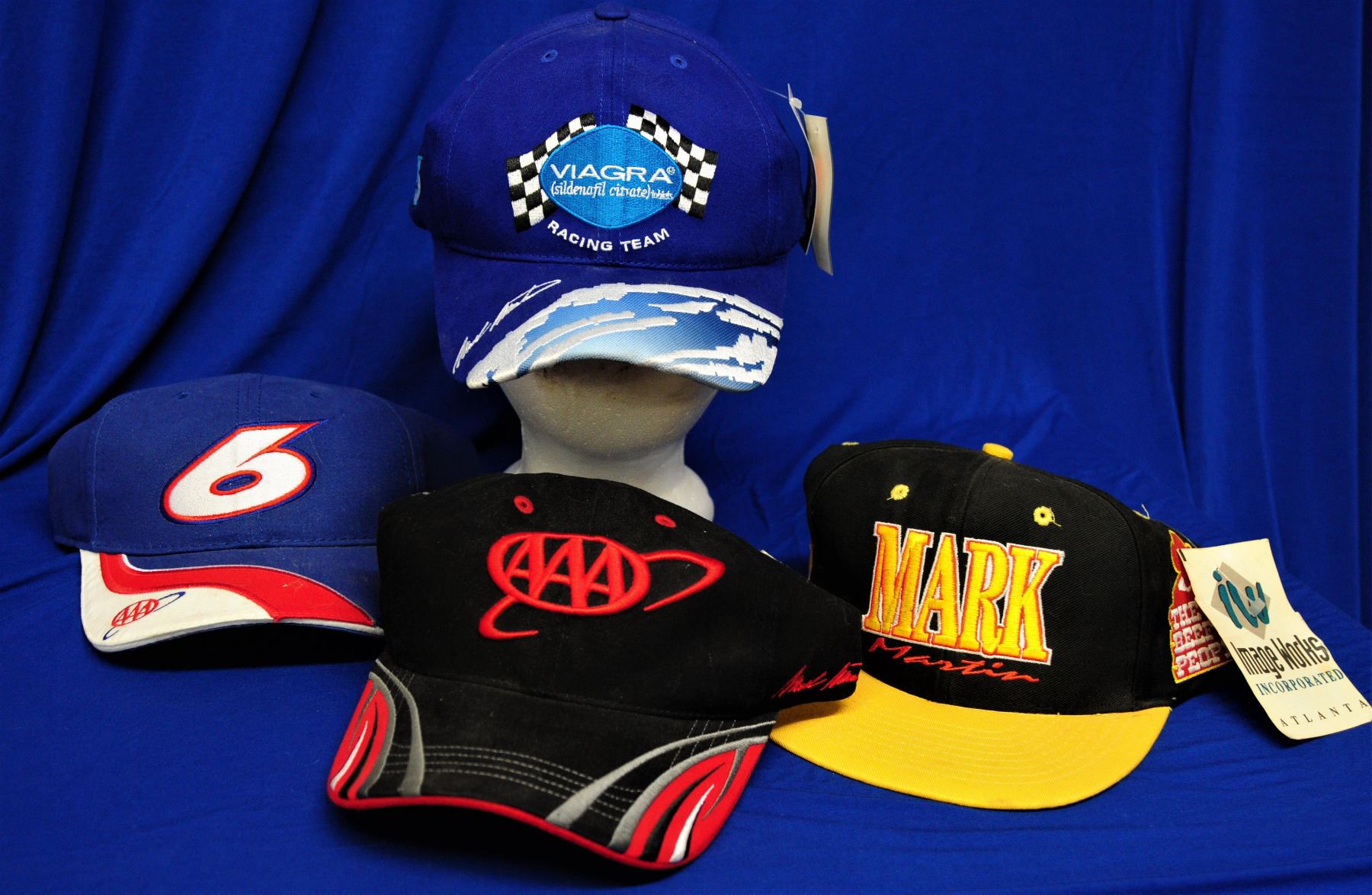 4 different ball caps, 3 stickers, 2 unopened packs of 6 cards and envelopes and 1opened pack, small Mark Martin bobble head