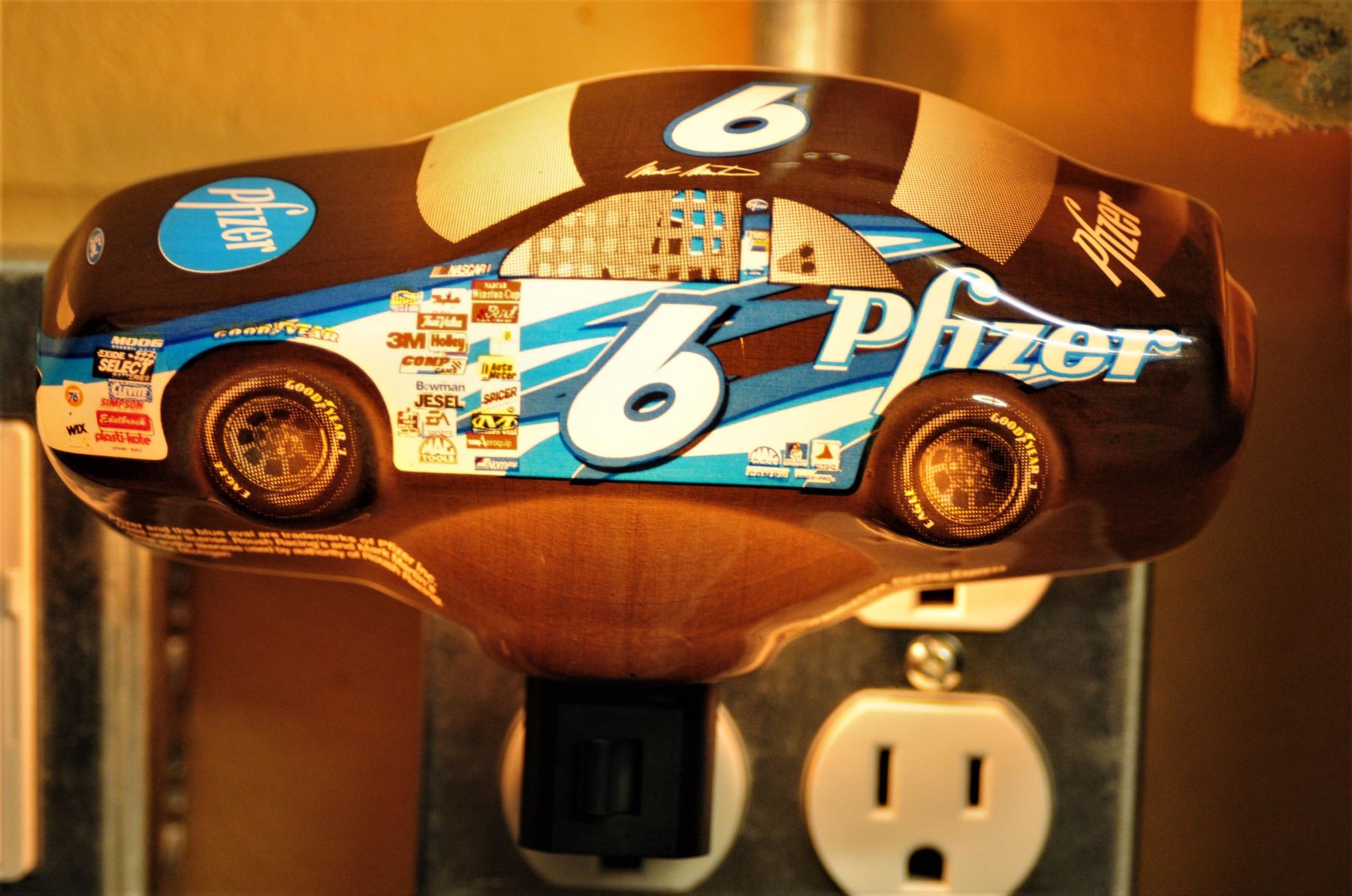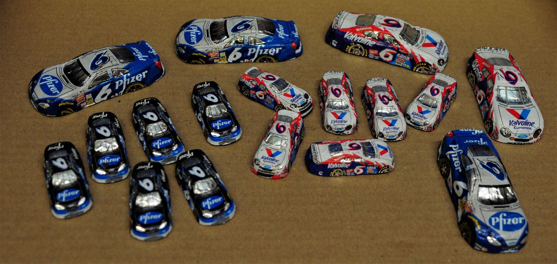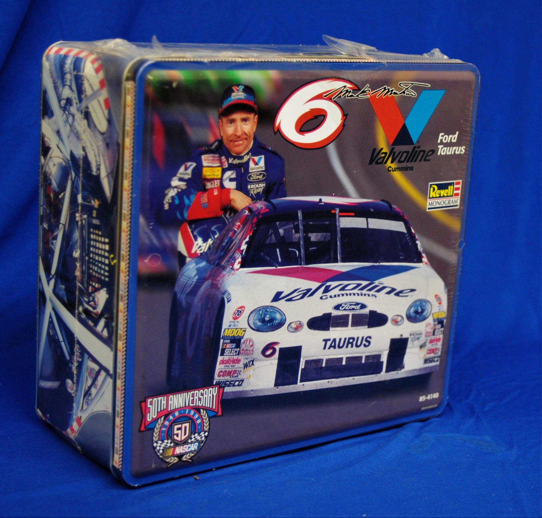 1) unused Mark Martin lunch box 2) #6 Pfizer Ford working night light 3) bag of #6 chocolate cars covered in tin foil