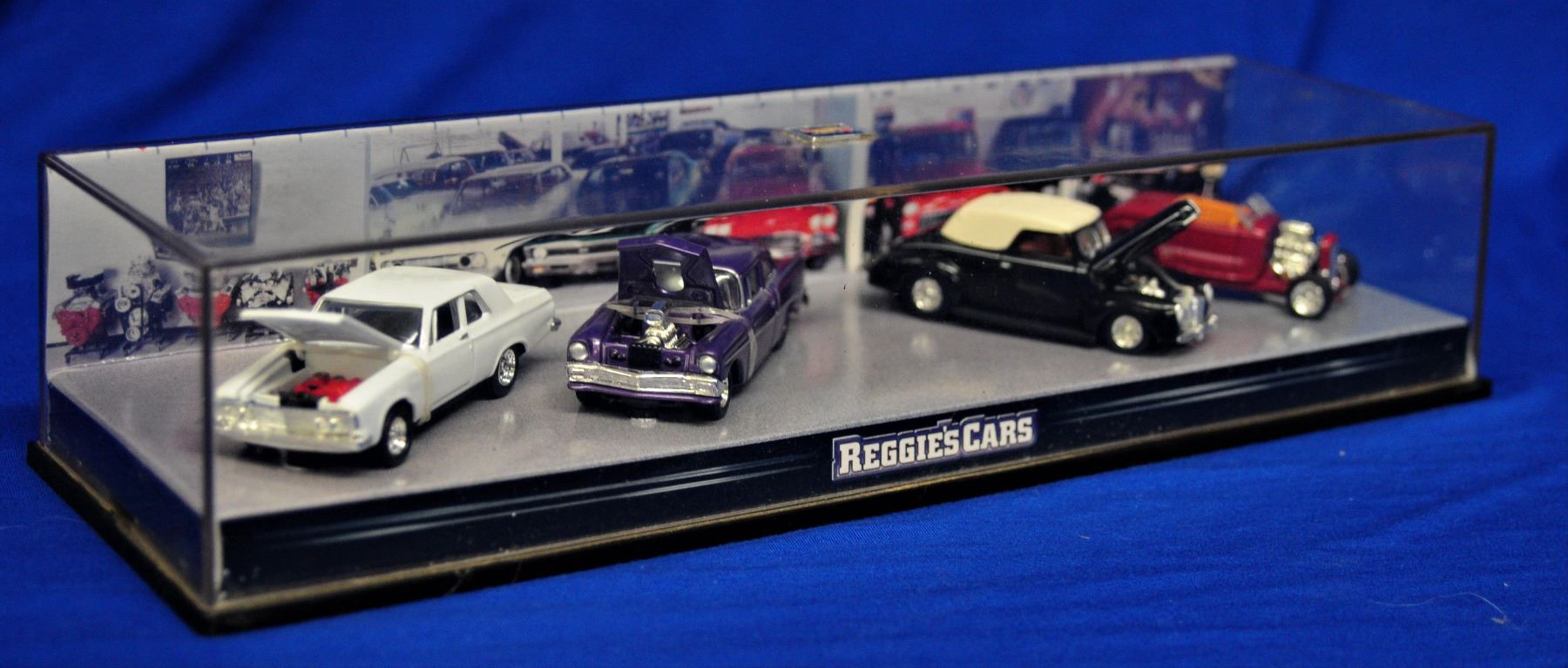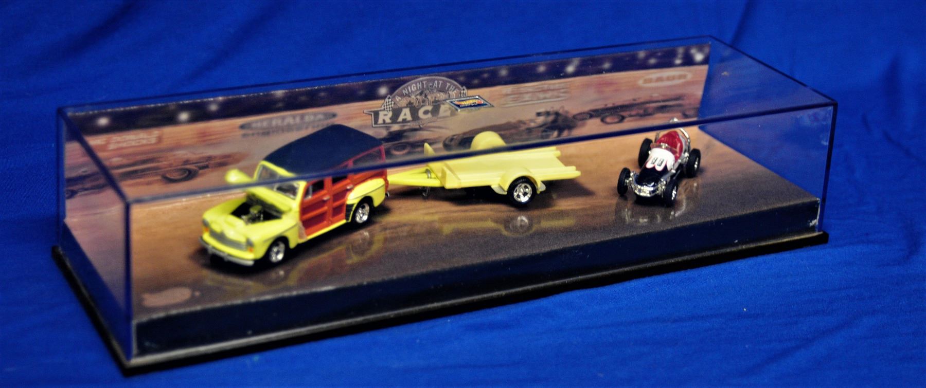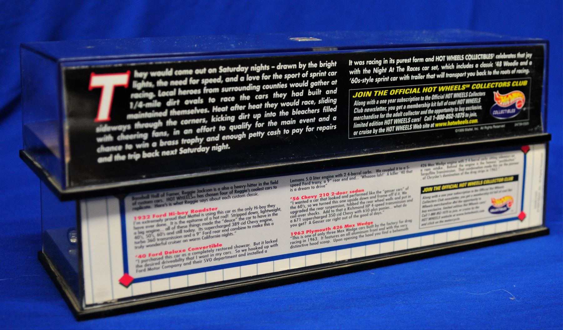two sets in display cases and as new condition 1) Reggie Jackson cars including a 1932 Ford Hi-Boy Roadster, 1940 Ford Deluxe Convertible, 1956 Chevy 210 2 door sedan and a 1963 Plymouth 426 Max Wedge 2) 1948 Woodie with trailer and a 60's style sprint car