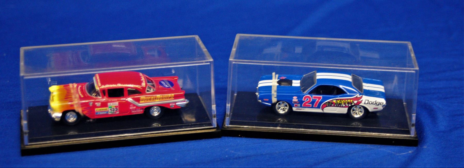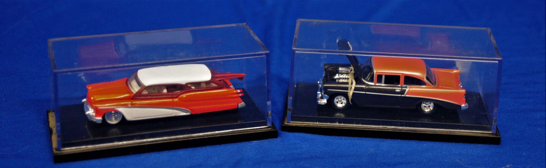 6 different vintage cars including muscle cars, 50's hot rods and more, all in their own display case and all cars are as new