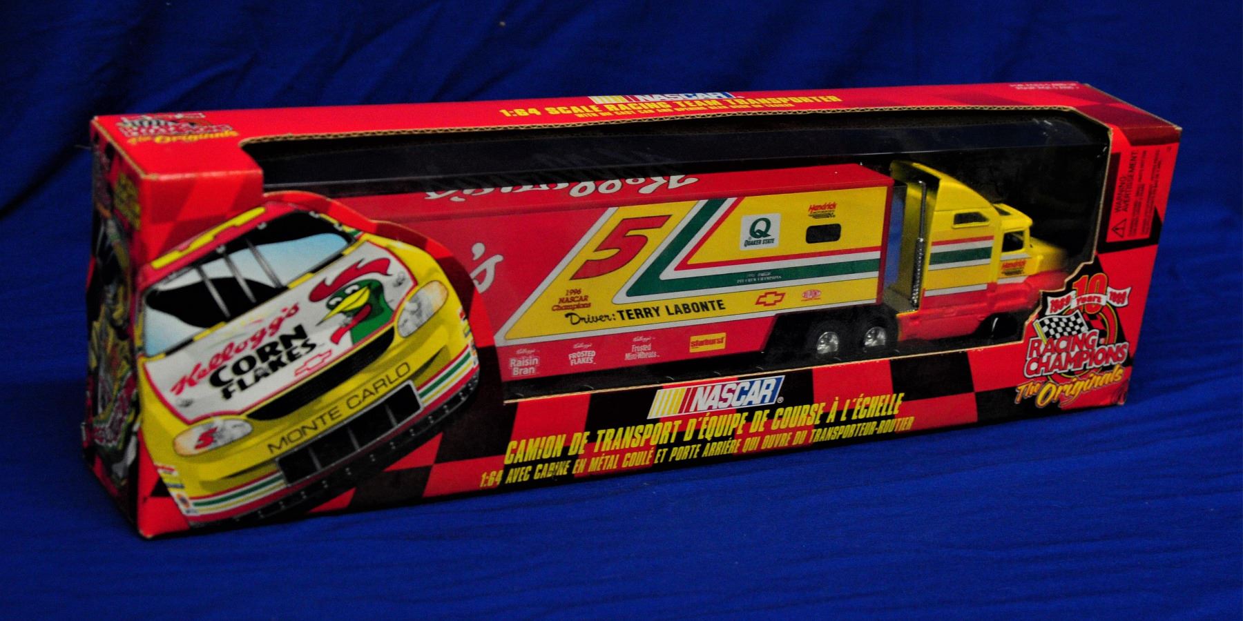 1) 1:64 scale Racing Team Transporter with die cast tractor and opening rear door on trailer 2) 1:64 scale 5 different Terry Labonte cars