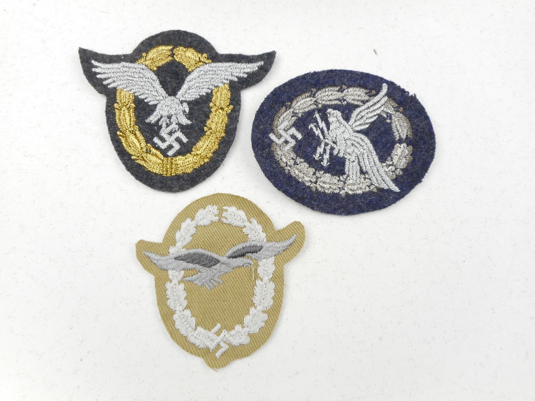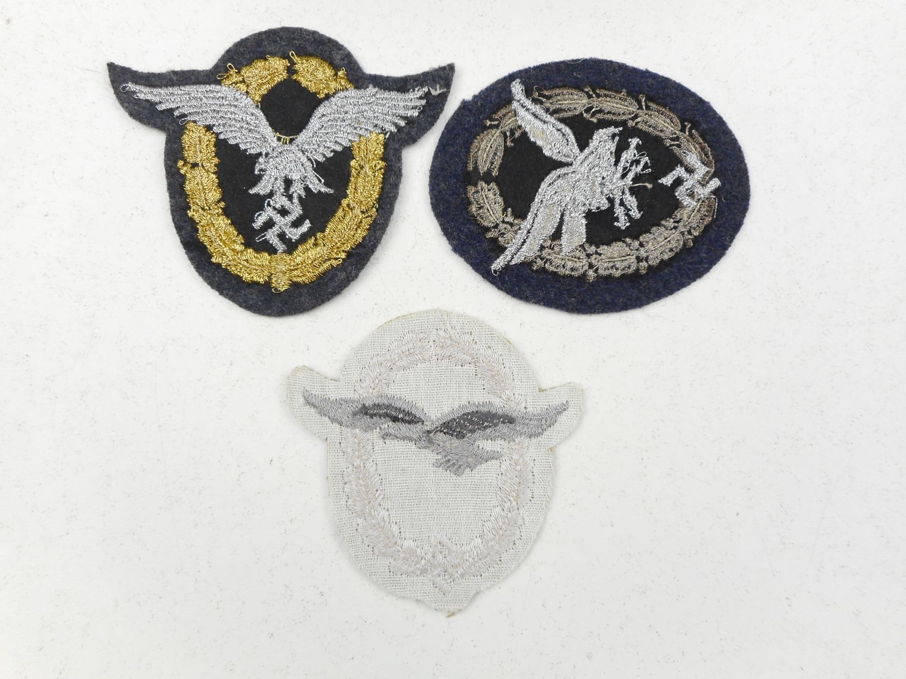 GERMAN WWII LUFTWAFFE BADGES , CLOTH BADGES (1) RADIO OPERATOR, (1) PILOT/ OBSERVER, (1) GLIDERS, SOME WITH METALLIC COLOURED THREAD, LOT OF 3