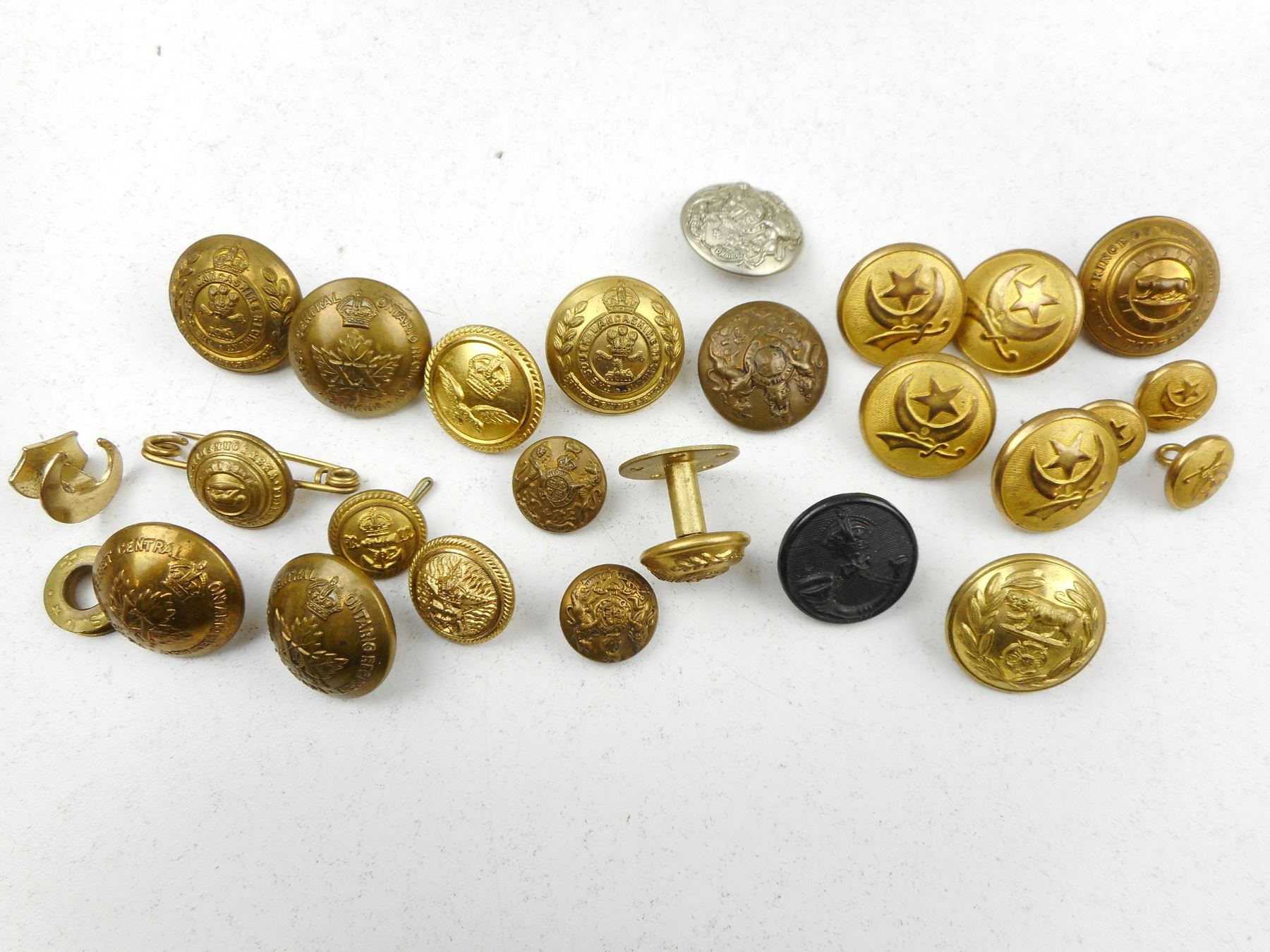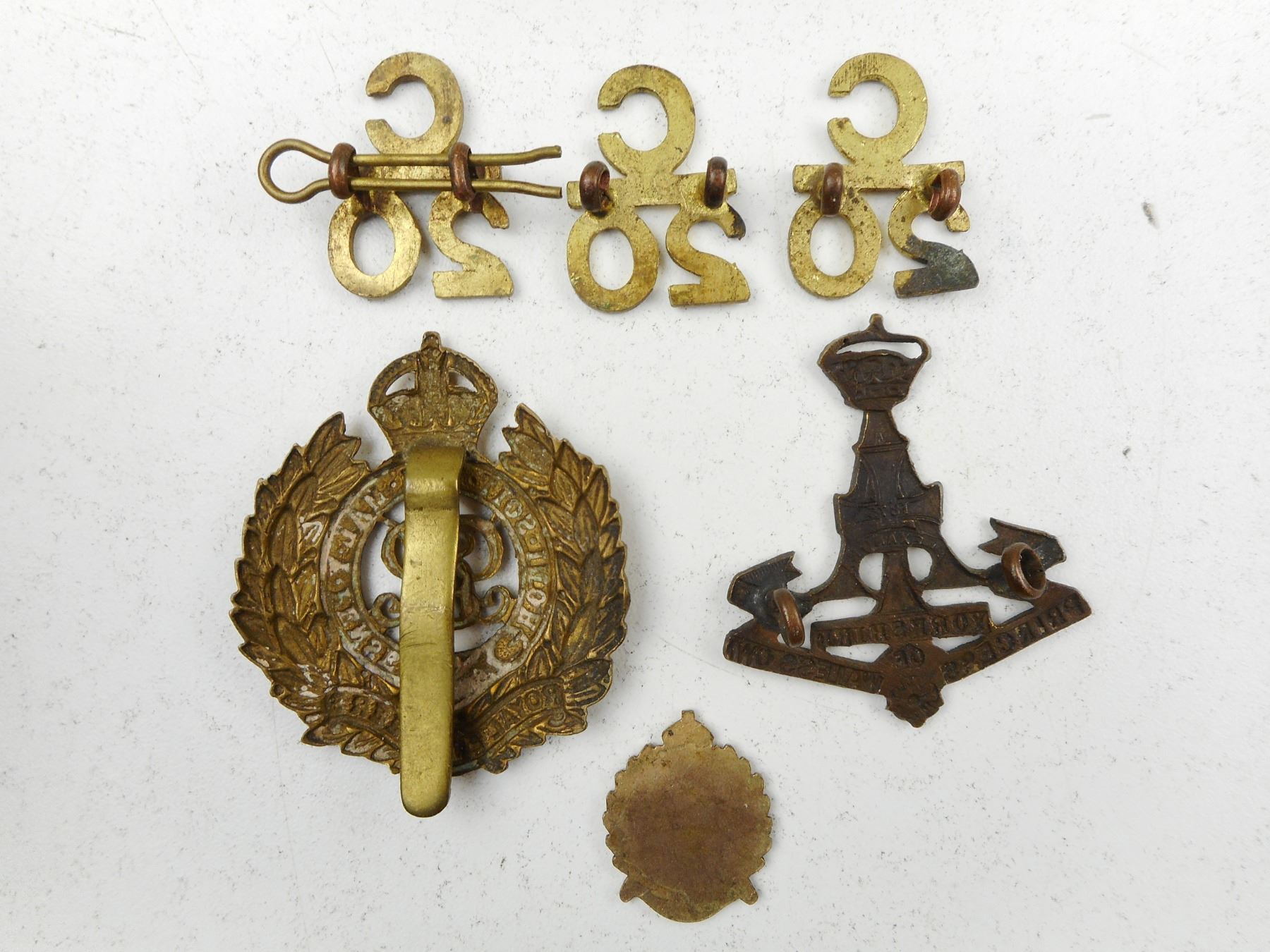 ASSORTED BADGES, BUTTONS & BELT BUCKLE , (1) PRINCESS OF WALESS OWN THE YORKSHIRE REGIMENT CAP BADAGE LUG BACK NO PIN, ROYAL ENGINEERS CAP BADGE SLIDE FASTENER, ASSORTED BUTTONS, GIBRALTAR BELT BUCKLE