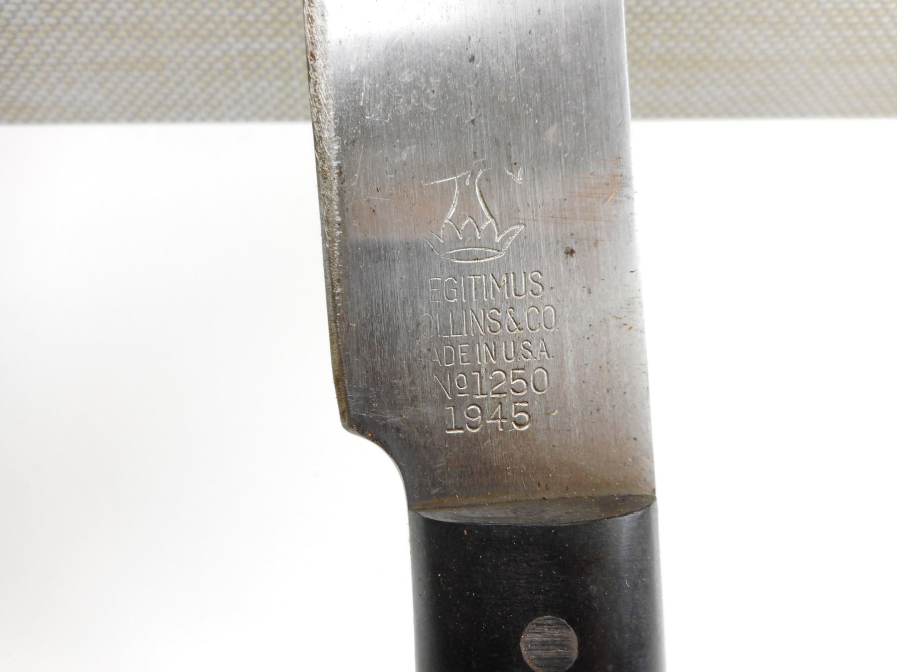 WWII U.S. LEGITIMUS COLLINS & CO MACHETE WITH SHEATH , RICASSO MARKED LEGITIMUS COLLINS & CO. MADE IN U.S.A. NO.1250 DATED 1945, WITH PLASTIC GRIPS, LEATHER SHEATH