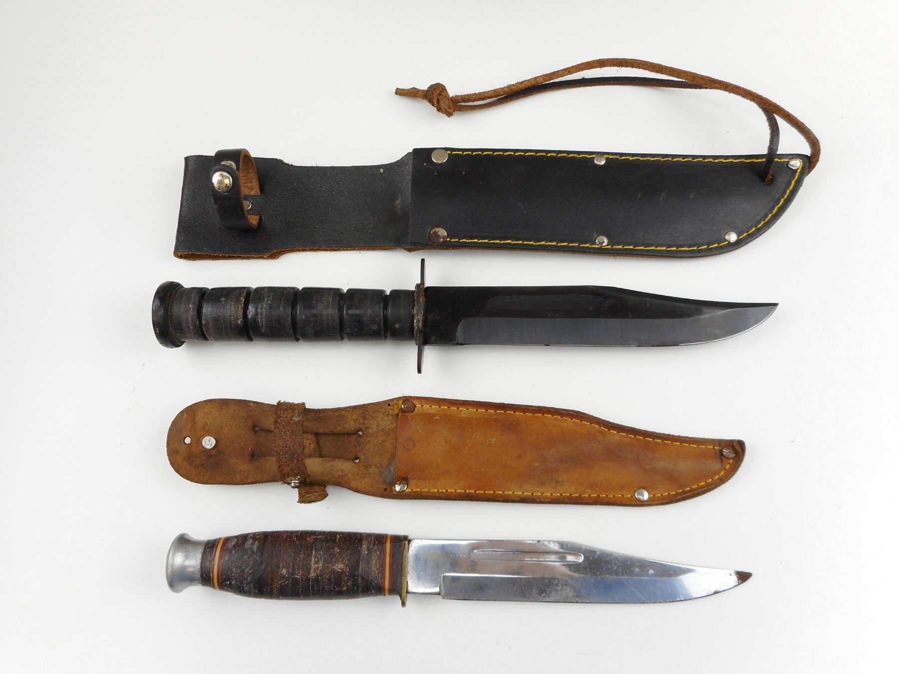 MILITARY -TYPE JAPANESE MADE KNIVES WITH SHEATHS , (1) K-BAR STYLE WITH SHEATH, (1) NICKLE PLATED HUNTING KNIFE & SHEATH, LOT OF 2
