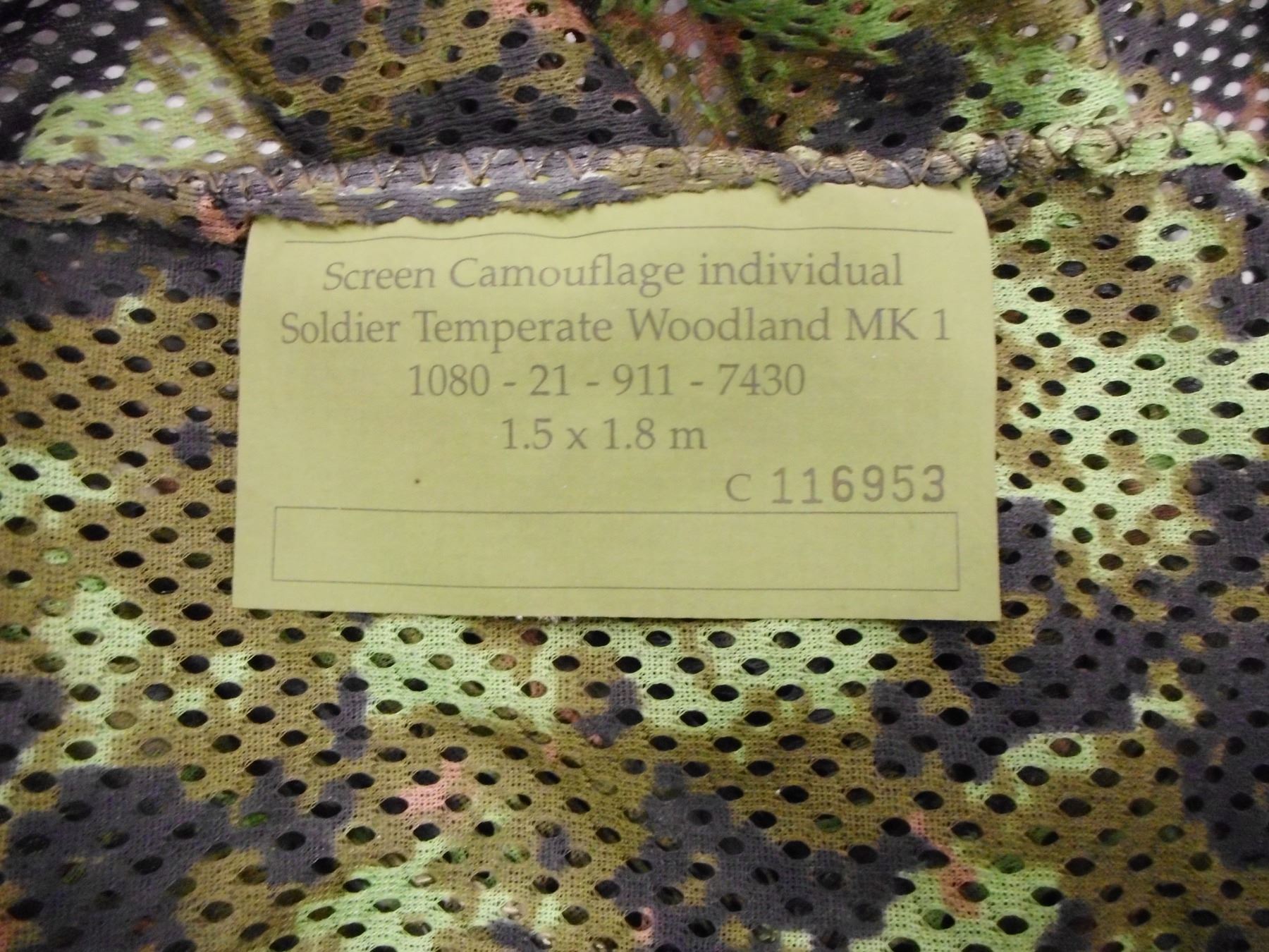 SOLDIER SCREEN CAMOUFLAGE, CANTEEN & KNEE PADS , (1) SCREEN CAMOUFLAGE INDIVIDUAL SOLDIER TEMPERATE WOODLAND MKI, (1) PLASTIC CANTEEN WITH COVER, (1) PAIR OF KNEE PADS