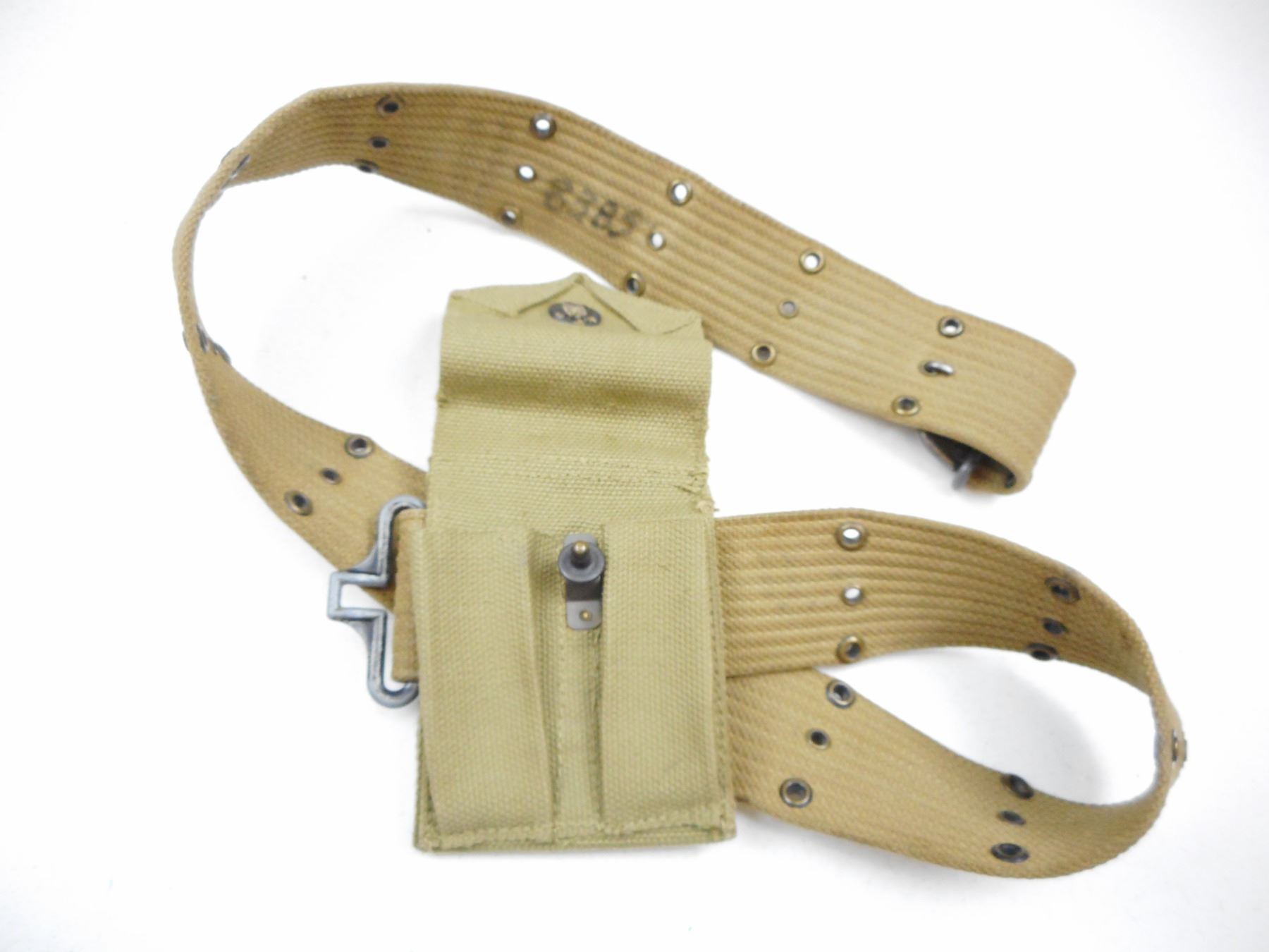 WWII LEATHER U.S. HOLSTER WITH BELT & MAGAZINE POUCH , (1) LEATHER HOLSTER STAMPED U.S. BACK STAMPED BOYT 44, INTERIOR STAMPED C-3341, WITH CANVAS BELT, MAGAZINE POUCH STAMPED 1942 HAFF. MFG. CO.