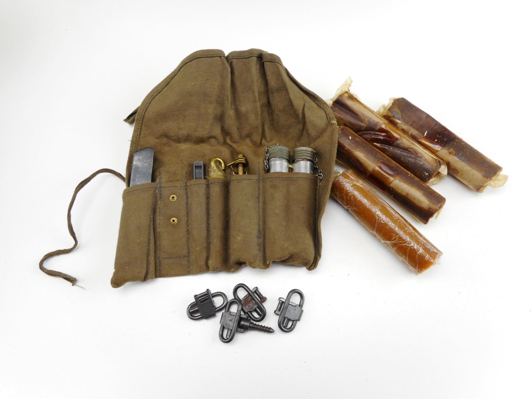 ASSORTED FIREARM ACCESSORIES/ CLEANING TOOLS , INCLUDES AGM42B CLEANING KIT, WAX CYLINDERS, & SLING RINGS