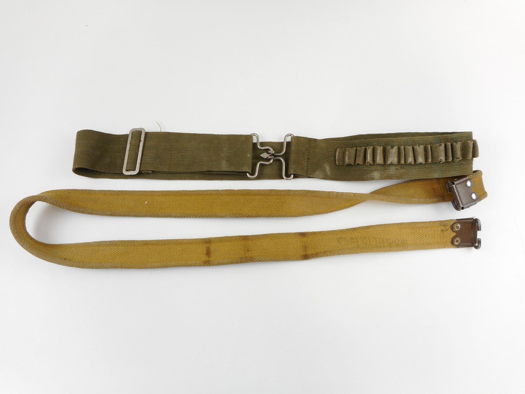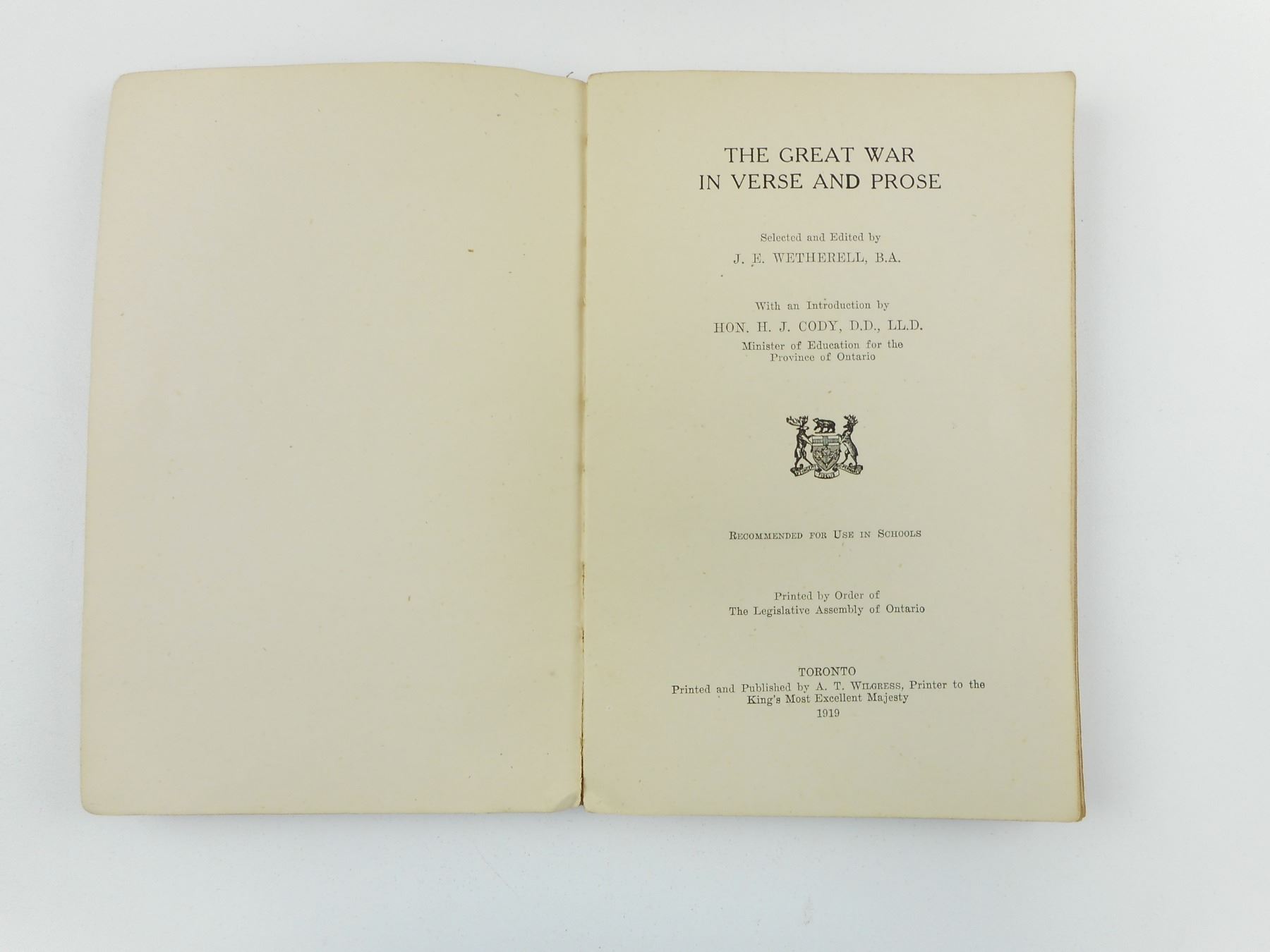 WWI BOOK: THE GREAT WAR IN VERSE & PROSE & CANVAS MILITARY BELTS , (1) BOOK COPYRIGHT 1919 FOR USE IN SCHOOL, INSIDE MARKED GERTRUDE BROOK, ROOM 8, MCHUGH SCHOOL, (1) CANVAS BELT STAMP IS TOO WORN, (1) CANVAS AMMO BELT WITH LOOPS