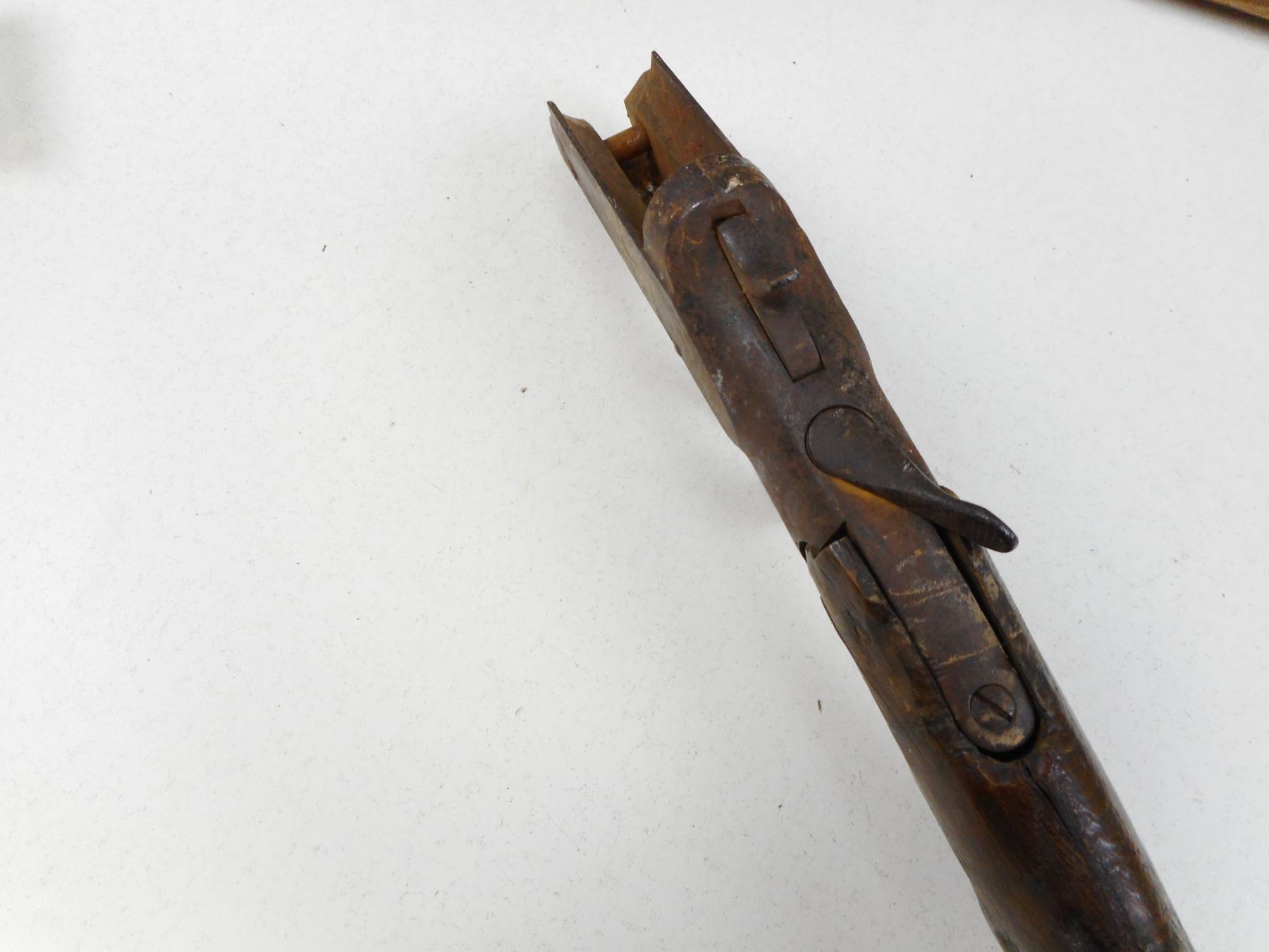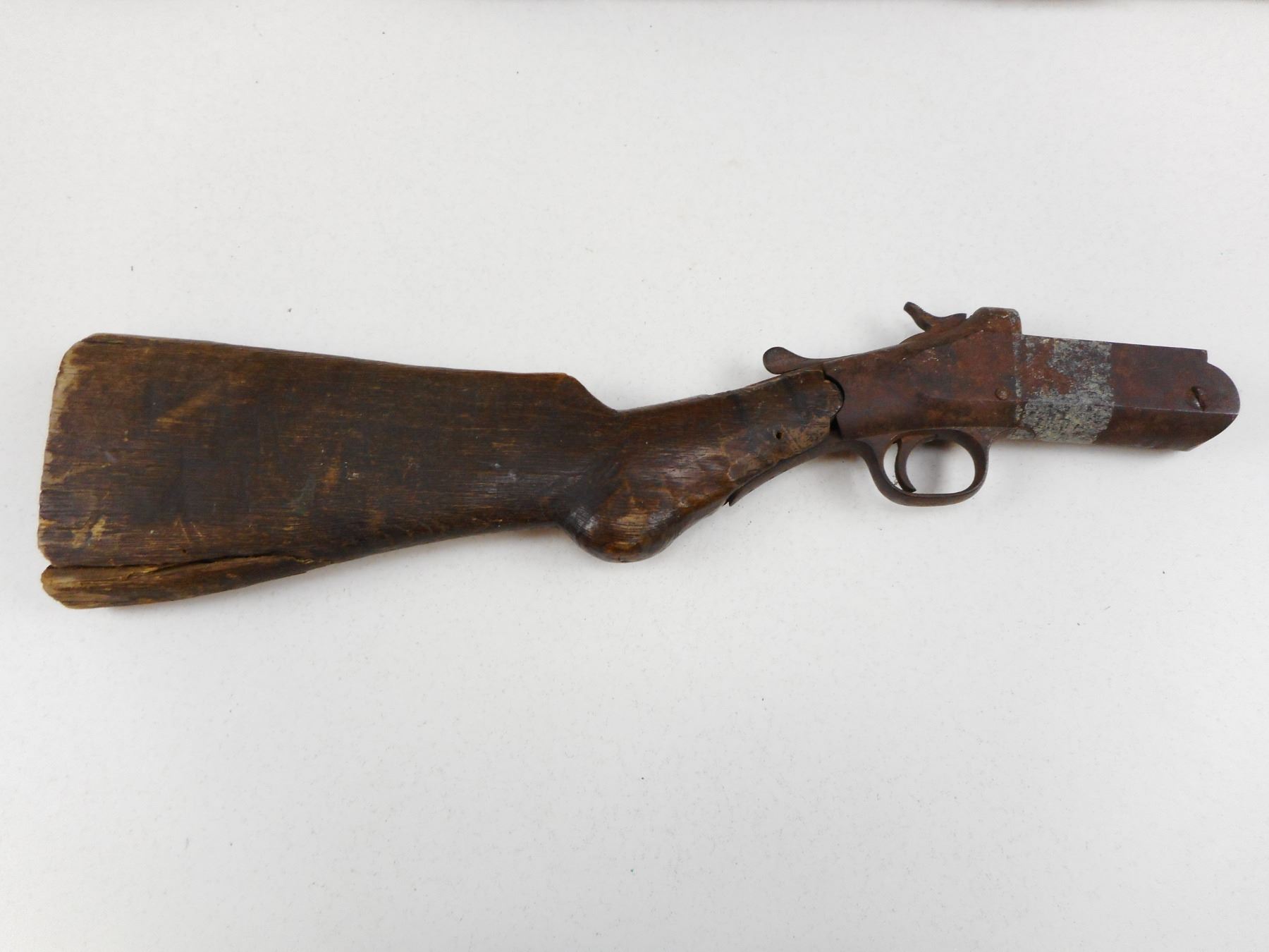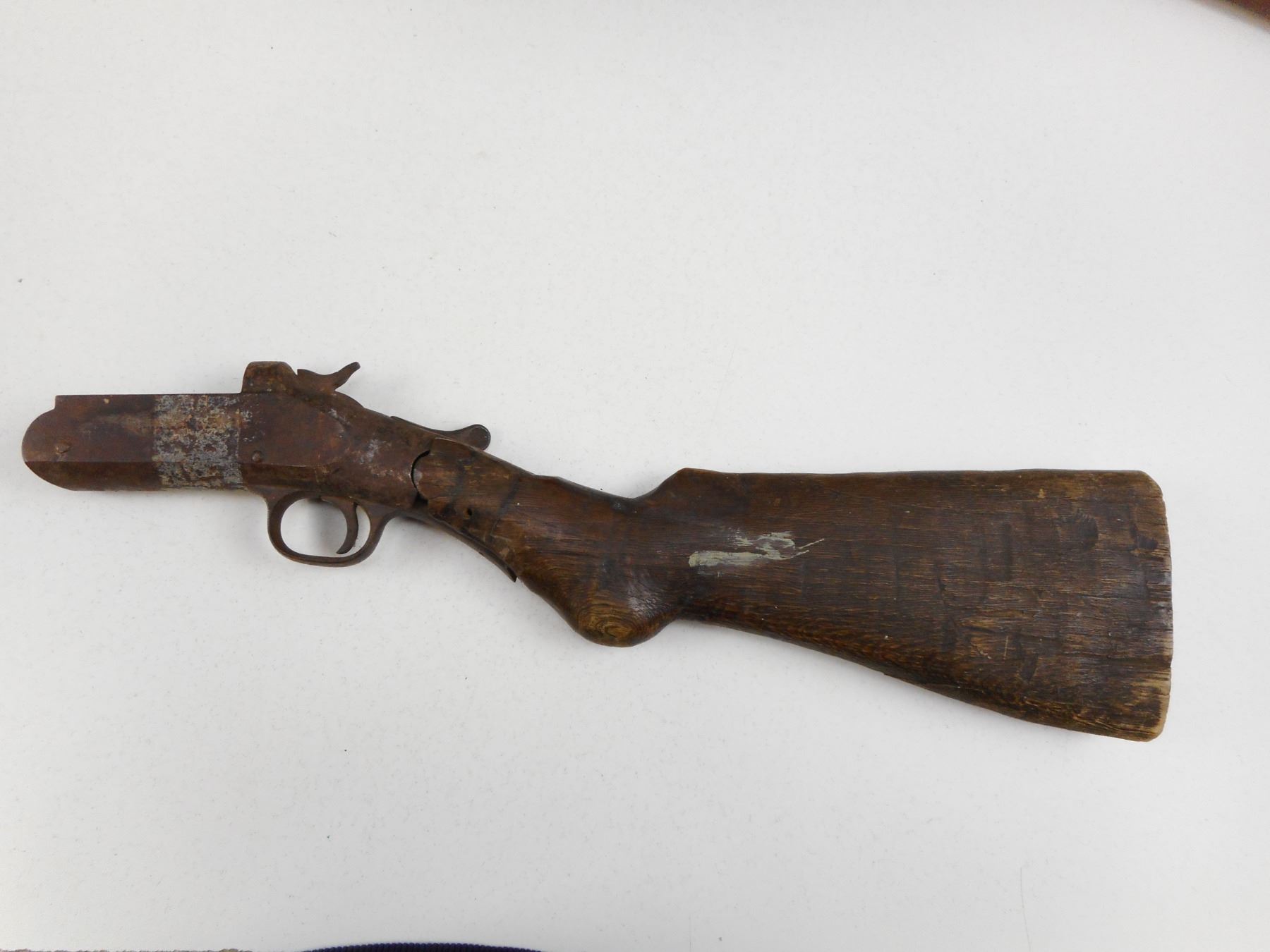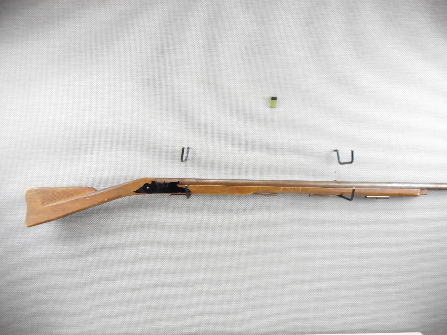 ASSORTED GUN PARTS, BARREL, NON-FIREARM , INCLUDES (1) MARLIN SAFETY BARREL MODEL 1895 WITH 26" BARREL FRONT BLADE SIGHT & ADJUSTABLE REAR SIGHT, VERY PITTED EXTERIOR; (1) STEVENS RECEIVER AND BUTT STOCK FOR BREAK ACTION, CRACKED WOODEN BUTT STOCK, RECEIVER IS VERY RUSTED (1) NON-FIREARM MUZZLELOADING TYPE TOY, TOTAL LENGTH 54", LOT OF 3