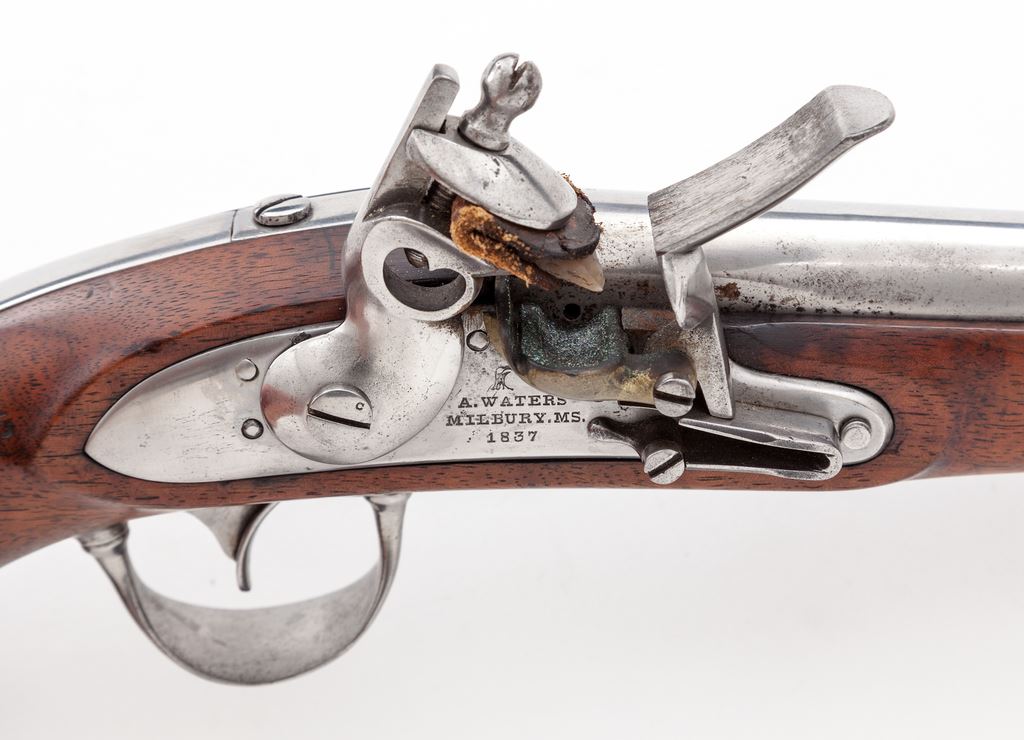 U.S. Model 1836 Flintlock Military Single Shot Pistol, by Asa Waters, Milbury, Massachusetts, NVSN, .54 cal., 8.5'' round steel barrel marked ''S./JCB/P'' at breech, integral brass blade front sight and distinctive ''dished oval'' rear sight, iron furniture including captive swivel type ramrod, one barrel band with long tang ending in lock sideplate, long rear barrel tang integral with buttcap, triggerguard with long rear tang abutting buttcap, lockplate marked ''(eagle head) / A. Waters / Milbury, MS. / 1837.'' Appears to be in original flintlock configuration with un-bushed touchhole; brass pan. Oil finished walnut stock marked ''365'' behind lock and with two oval inspectors' marks on opposite side. Condition is excellent as original, with metal parts polished bright, sharp edges and clear markings. Walnut stock is likewise, being smooth, unblemished with excellent grain and coloration, and clear markings. Action is tight and crisp, bore appears shiny. A lovely, untouched and exemplary piece for the advanced collector of early U.S. martial pistols and American flintlocks. Est.: $2,500-$3,500. (Antique)(Joe Poyer collection)