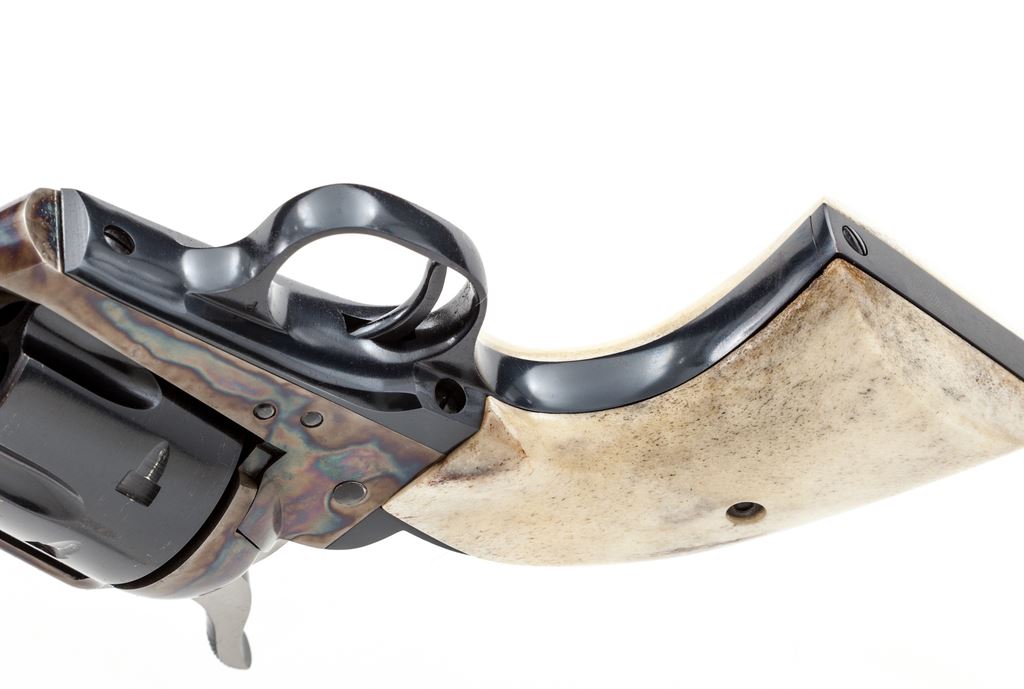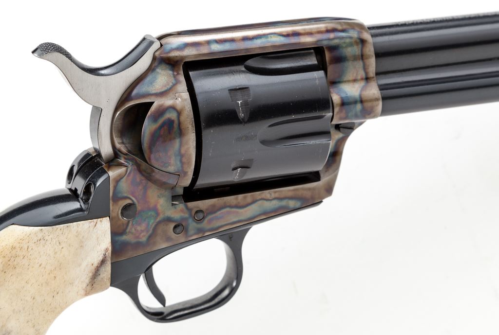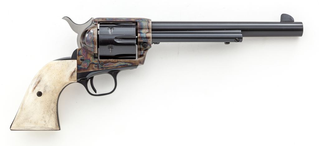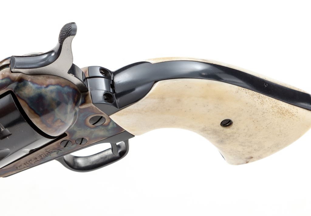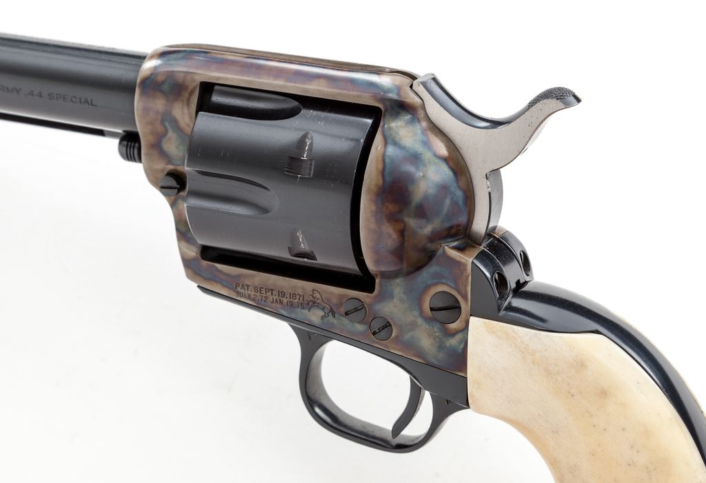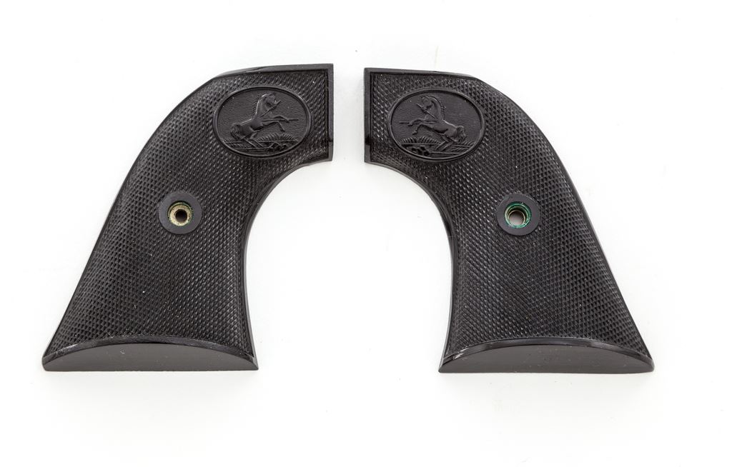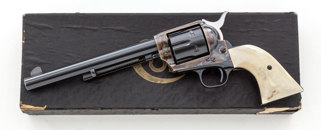 2nd Generation Colt Single Action Army Revolver, #23429SA, .44 Spec. cal., 7.5'' barrel, blue and case hardened finish, stag and original black checkered plastic grips, in early Colt black box numbered to revolver. Mfg'd 1959. Condition is excellent showing only the slightest marks from handling. Box with loss to front edge of lid (piece retained in box). Est.: $2,000-$3,000. (C&R/PPT)