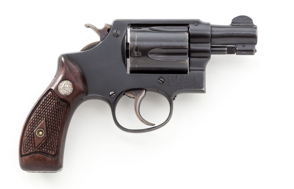 Smith & Wesson .38 Chief's Special Double Action Revolver, #673, ,38 Spec. cal., 2'' (1-7/8'') pinned barrel, blue finish, factory checkered round butt diamond center magna walnut grips with S&W medallions, standard square notch rear sight and forged round blade front sight on a 5-screw J-Frame with the early round triggerguard and flat latch. Shipped in November 1951, with information sheet from Roy Jinks. This version is the original configuration of the Chief's Special and is often called a ''Baby Chief''. Condition is near excellent with approx. 95%-97% factory blue, light index mark on the cylinder, small rub on left front of barrel, and light wear on high spots. Crisp grips and action, bright bore. Gun is in a later blue Bangor-Punta box. Est.: $1,200-$1,500. (C&R/PPT)