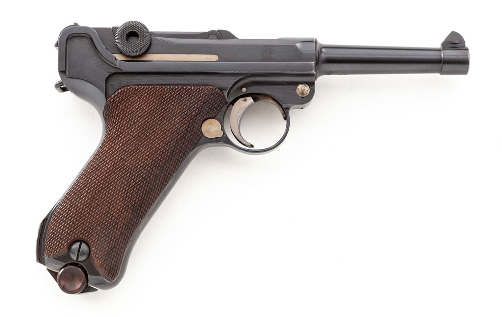 Commercial Model 1919 Luger, by DWM, #73282, .30 Luger cal., 3.75'' barrel, blue finish, straw small parts, checkered walnut grips, with one unmarked wood based tin-plated magazine. ''(Crown)/N'' markings to upper receiver and bottom of barrel. Chamber area blank, toggle marked DWM, ''Geischert/Geladen'' thumb safety and extractor, with all visible matching numbers. Condition is excellent retaining approx. 98% lightly thinning blue, which appears to be original as serial numbers to bottom of barrel are clearly stamped through the finish. Straw small parts have thinned to approx. 90%. Grips show minor wear. Crisp action, fine bore. Est.: $1,000-$1,500. (C&R/PPT)