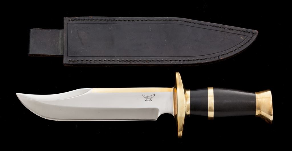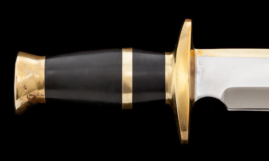 Large Bowie Knife, by John Nelson Cooper, with sheath, 9.5'' blade with 4.75'' brass spine, 15'' overall, brown micarta handle with one thick brass spacer, brass pommel, and thick brass full guard. Left side of blade is marked with Cooper eagle logo. Included is a black leather sheath that is stamped ''Cooper'' on backside of belt loop. Condition is excellent. Blade with a small amount of light scratching. Pommel appears to have had a few spots of verdigris that were cleaned leaving areas of mild discoloration. Cooper logo is clear and well defined. Sheath shows moderate storage wear. Est.: $750-$1,000.