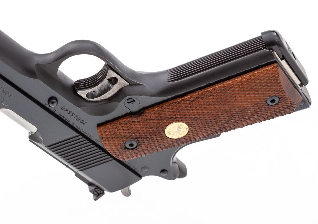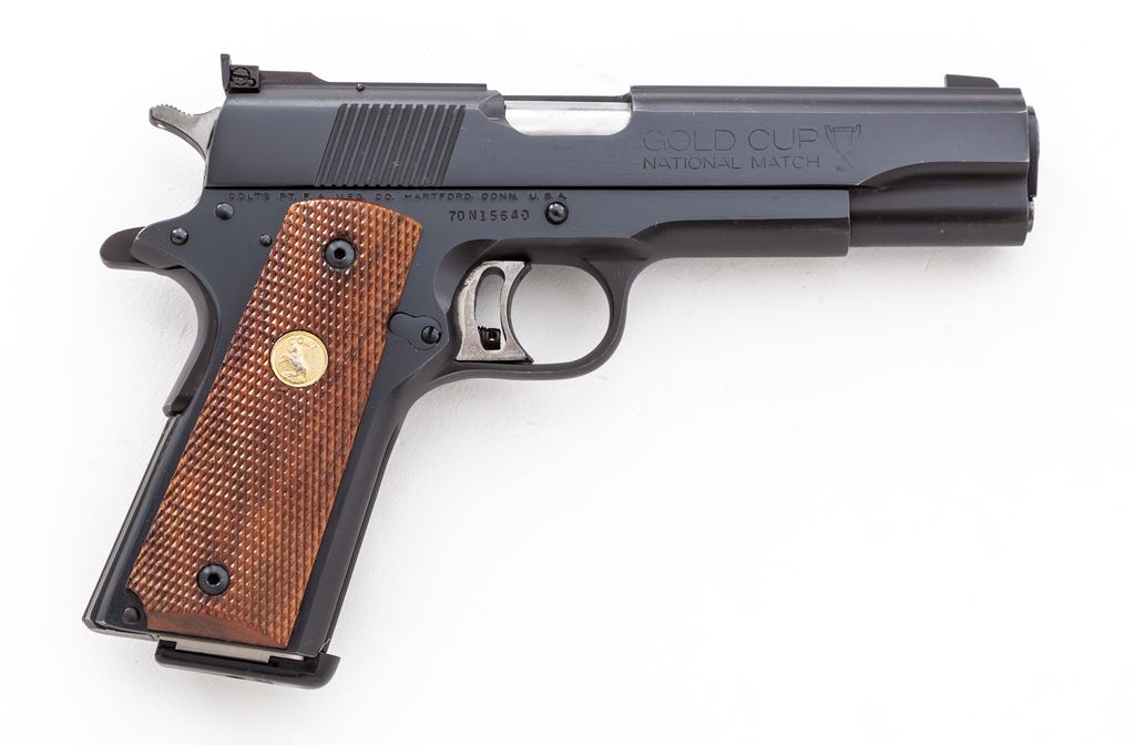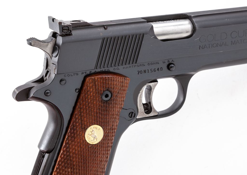 Mid-70's Colt MK IV Series 70 Gold Cup National Match Semi-Automatic Pistol, #70N15640, .45 ACP cal., 5'' barrel, blue finish, checkered wood grips with gold Colt medallions, adjustable trigger, fixed front sight, fully adjustable Elliason rear sight, with one Wilson Combat magazine. In original simulated wood grain Colt box (no end label) with misc. factory paperwork (no owner's manual). Mfg'd in 1974. Condition is excellent with approx. 99% original blue. Metal shows only a small amount of light handling marks. Exposed portion of the barrel at the chamber area shows moderate rub marks. Grips appear near new with clean sharp checkering and bright medallions. Action and shiny bore are both excellent. Est.: $1,400-$2,000. (C&R/PPT)