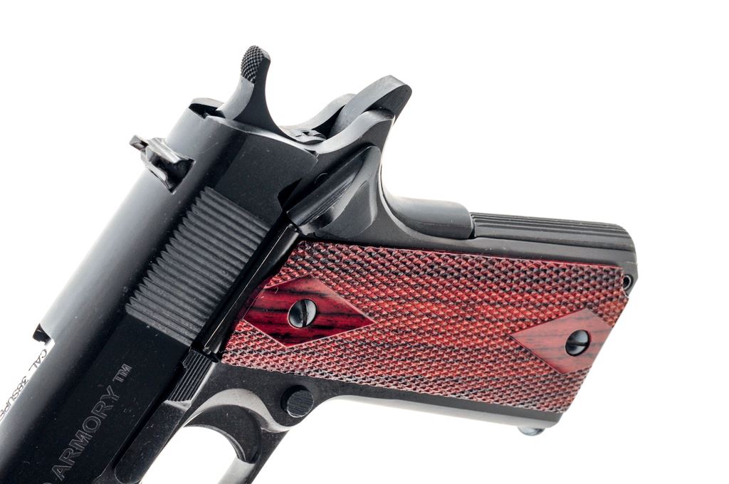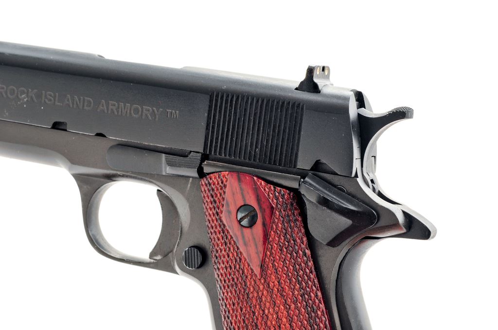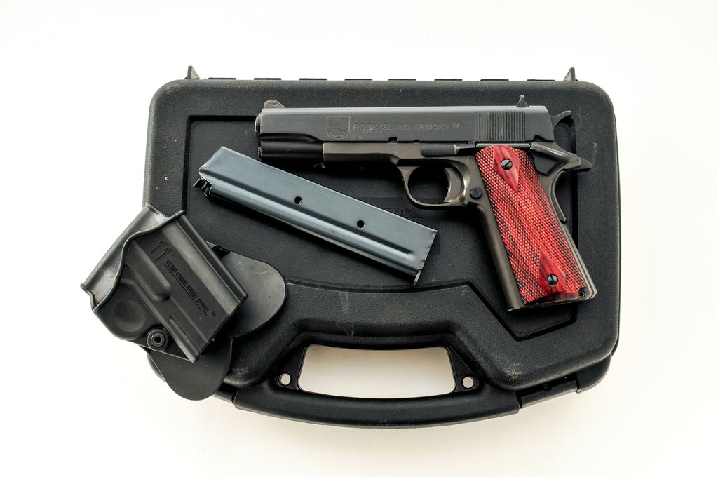 Rock Island Armory Model 1911-A1 FS Semi-Automatic Pistol, #RIA1319433, .38 Super cal., 5'' barrel, parkerized frame, matte blue slide, checkered double diamond wood grips, with standard fixed sights, including red dot front sight and white two-dot rear sight. Included with this pistol is one standard magazine, one high-capacity magazine that appears to be 15-rounds, original plastic case with matching end label, and Springfield Armory ''11 Gear'' paddle holster. Condition is near excellent with approx. 98%+ remaining factory finishes, showing normal small handling marks and surface scuffs to the metal. Right grip with a small amount of flaking to the finish on the bottom edge; checkering on both grips is sharp. Action and bore are both excellent. Est: $300-$400. (Modern/PPT) (High cap mags not available to Calif. residents.)