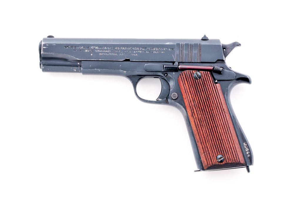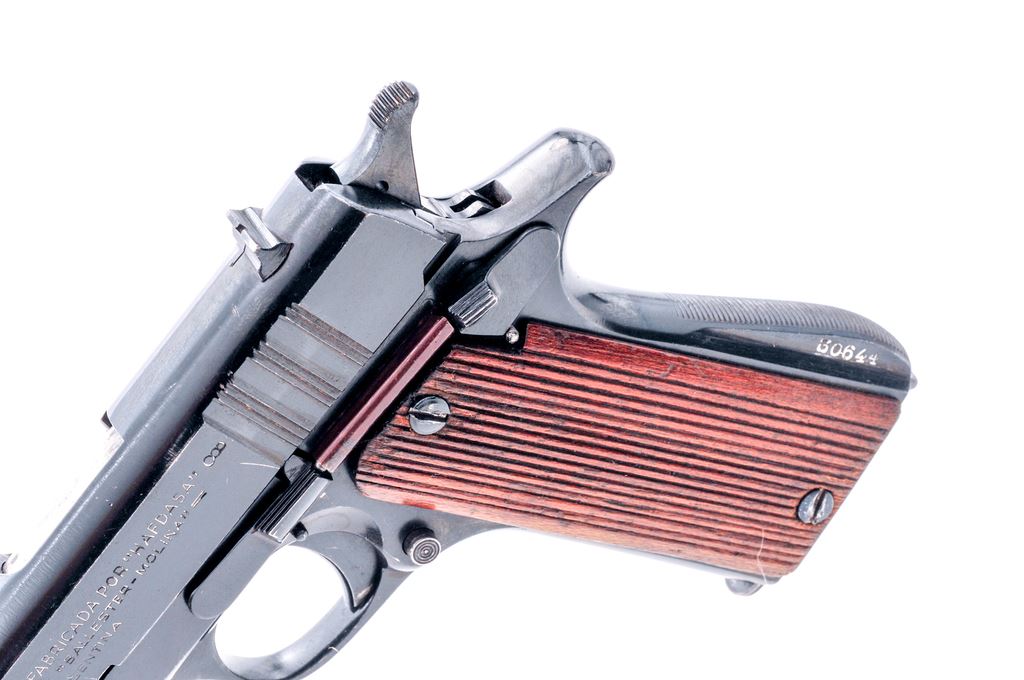 ''Armada Nacional'' Ballister-Molina Semi-Automatic Pistol, #30644, .45 ACP cal., 5'' barrel, blue finish, reeded mahogany grips, with one WWII era U.S. contract magazine. Right side of frame with ''(Argentine crest)/Republica Argentina/Armada Nacional'', with light import marks just below to frame. (Ref. the book, ''The Model 1911 and Model 1911A1 Military and Commercial Pistols'', page 474, by Joe Poyer.) Condition is very good to near fine retaining approx. 85% factory blue. Grips with mild impressions. Grip screw slots with some marring. Good action, very good bore. Est.: $600-$800. (C&R/PPT) (Joe Poyer collection)