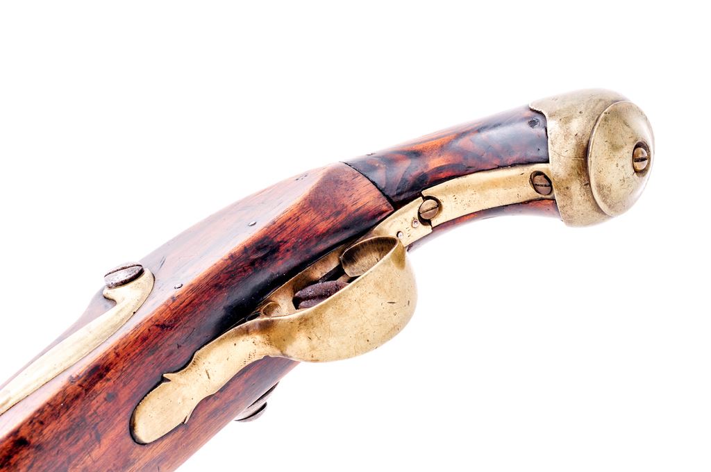 Heavy Large Bore English Flintlock Single Shot Military Pistol, NVSN, approx. .76 cal., 10'' round smoothbore iron barrel, hardwood stock. Barrel with two ''(crown)/(crossed swords)/R'' proofmarks ahead of breech; iron lockplate with large attractive crown stamping. Brass serpentine sideplate, triggerguard, shield nameplate at wrist, buttcap and ramrod thimble; brass-tipped wooden ramrod. Appears to be in original flintlock configuration with un-bushed touchhole. Condition to metal is good to very good with clear markings and an overall lightly etched brown patina. Stock is poor, with crude patches at wrist and forend. Smooth and tight action, clean bore. A truly deserving restoration project. Est.: $600-$1,200. (Antique)