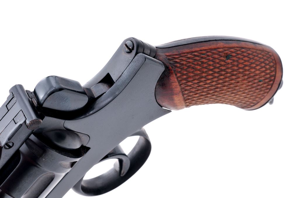 Japanese Type 26 Double Action Revolver, by Tokyo Arsenal, #17719, 9mm Japanese cal., 4.75'' barrel, blue finish, checkered walnut grips, in clamshell leather holster with cleaning rod. Mfg'd 1893-1924, with fewer than 60,000 total production. Condition is excellent as refinished, retaining approx. 98% immersion blue. Grips with minor flattening to coarse checkering. Action is good, bore is bright. Holster shows tight stitching, scuffs and minor staining. Est.: $400-$600. (C&R/PPT)