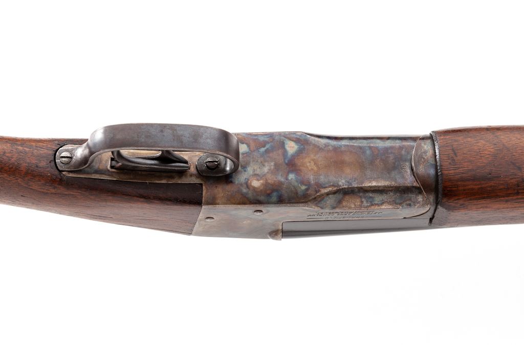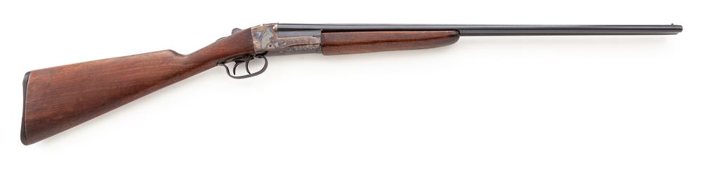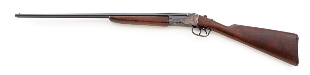 Very Original Stevens/Springfield Field Grade .410 Side-by-Side Shotgun, #E81588. 26'' .410 bore barrels have 3'' chambers and are choked Full/Full. Action is simple case hardened boxlock with crossbolt lockup. Double triggers, auto safety, and plain extractors. Straight-grained walnut semi-beavertail forend and straight grip buttstock are uncheckered, with plain Stevens buttplate. Probably mfg'd 1930's. Condition is amazingly original, with very few marks to wood and approx. 98% case hardening to receiver. Action is still tight and functions correctly; bores are excellent. A nice little gun for Field or Skeet. Est.: $350-$500. (C&R)