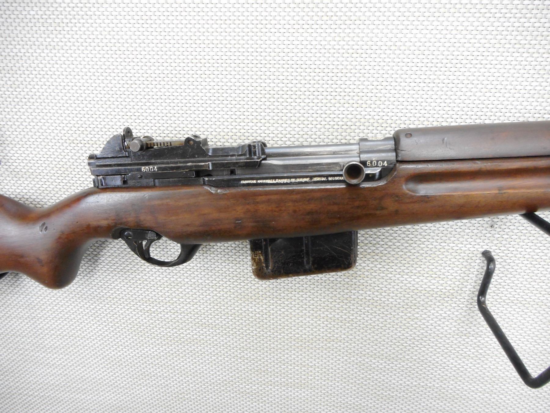 FN , MODEL: SAFN 49, CALIBER: 7MM MAUSER , COMES WITH MAGAZINE, VENEZUELAN CONTRACT WITH MARKS, BORE IS EXCELLENT, BOLT AND RECEIVER MATCH BY SERIAL #, RETAINS FULL MILITARY CONFIGURATION, BARLEY CORN FRONT AND PEEP REAR SIGHTS, SLING SWIVEL LOOPS, RIBBED STEEL BUTT PLATE, MUZZLE BREAK AND BAYONET LUG, SHOWS SOME HANDLING MARKS , ACTION: SEMI AUTOMATIC RIFLE , BARREL LENGTH: 24" , CONDITION: 7/10 , STOCK # 9520 , SERIAL # 6004 , CLASS: CANADIAN NON RESTRICTED CLASS