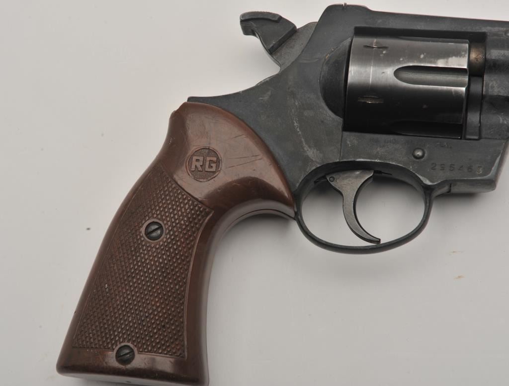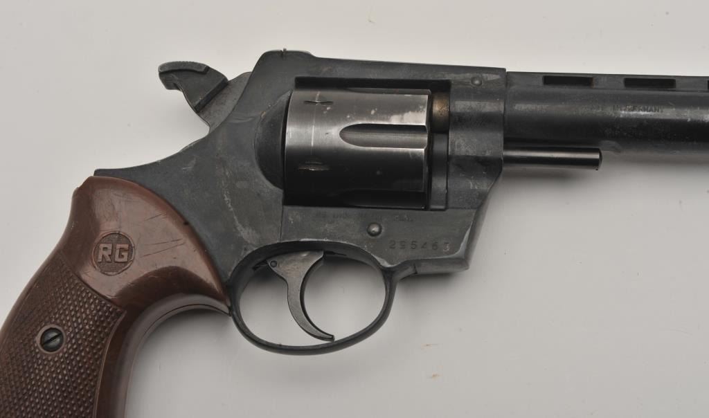 Imported by RG Rohm GMBH Model 38 S DA revolver, .38 Special caliber, 4” ventilated rib barrel, blued finish, checkered brown plastic grips, S/N 295463; overall fair condition and in need of a careful cleaning; action is working but gummed up, good bore, good grips. (Modern/NO CALIF. SALE). Est.: $30-$60.