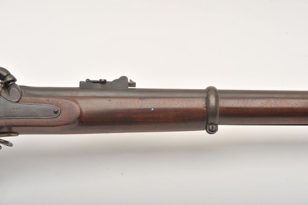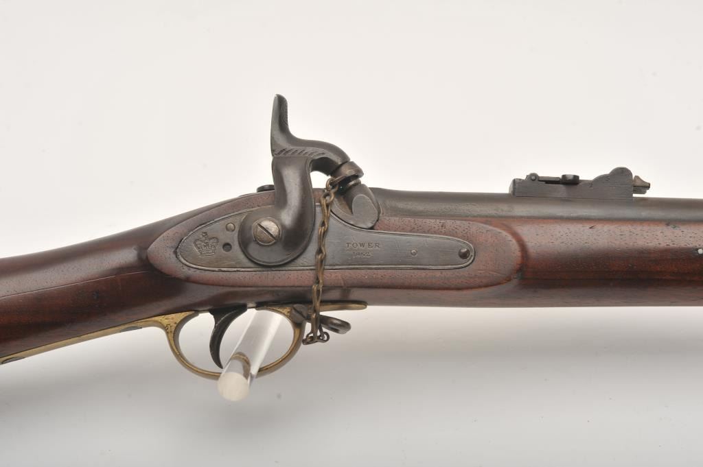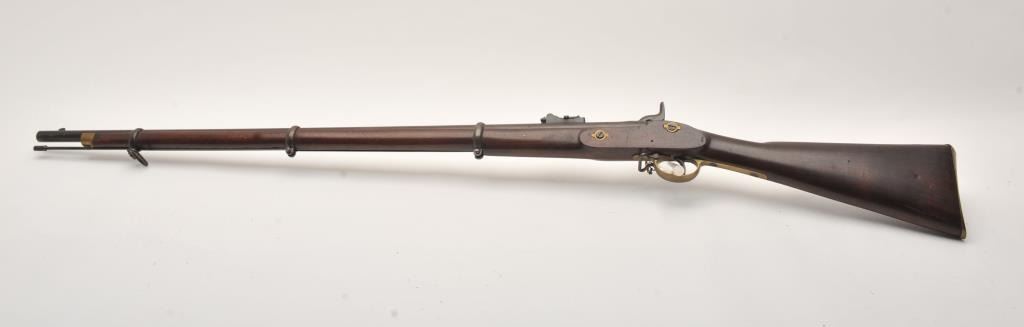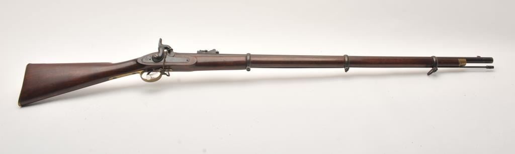 Enfield Model 1859 rifled 3 band .58 caliber musket dated 1862 and Tower arsenal marked. “W” and “B” marking on the left side of the stock. “P” and “W.A.” over “T.V.” behind trigger guard. Very good plus overall with exceptionally nice stock. Good action. In storage for decades and would clean well. Dr. Cairns collection. (Antique) Est.: $500-$1000