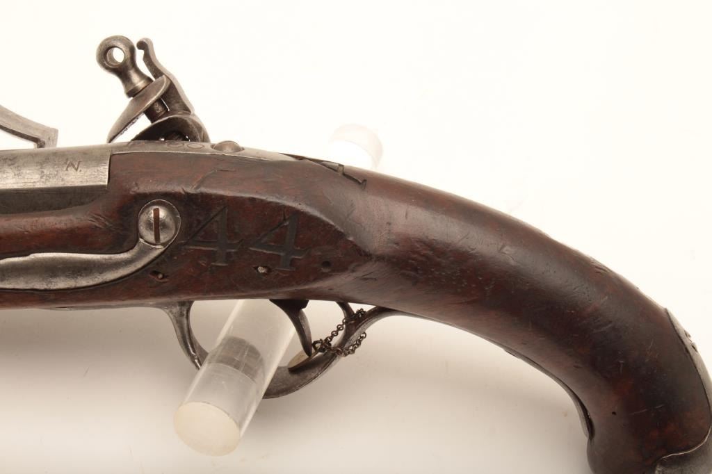 French Model 1763 .69 caliber flintlock pistol with iron mounts. No visible lock markings. Tang marked “B 36” in arsenal style stamps. Also “44” carved in wood behind the side plate. The area behind the lock plate has lost wood and shows opening. Also carved large “A” behind the tang. Good overall. Repaired and re-issued. (Antique) Est.: $800-$1600