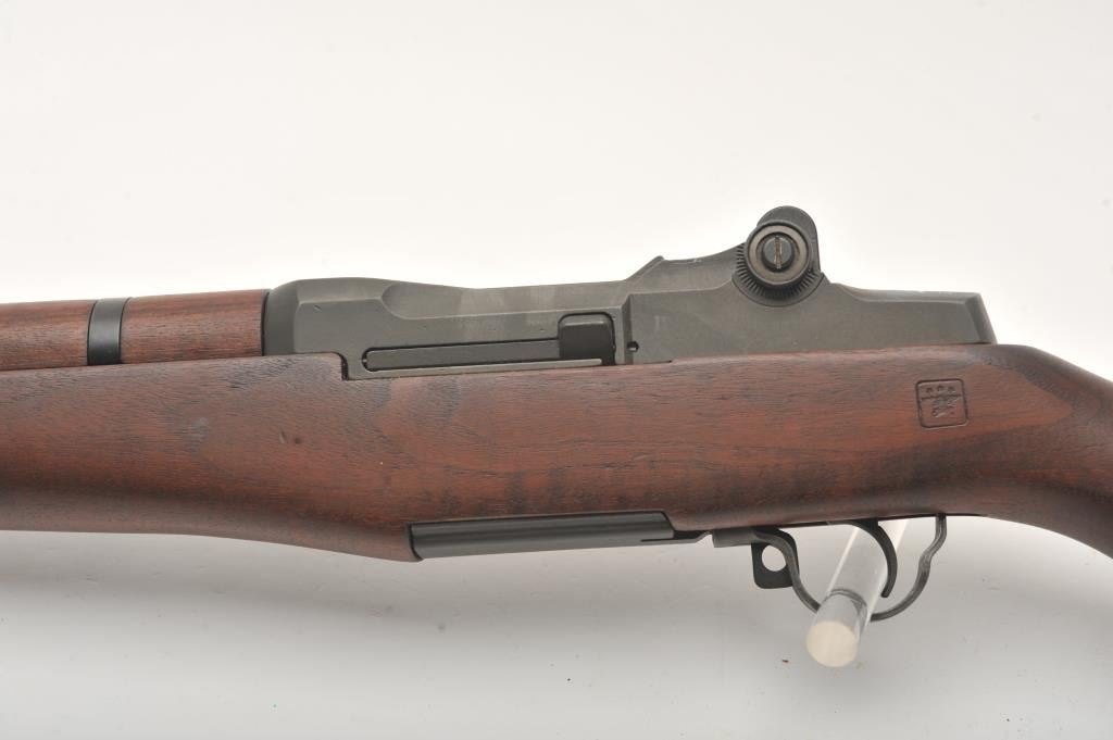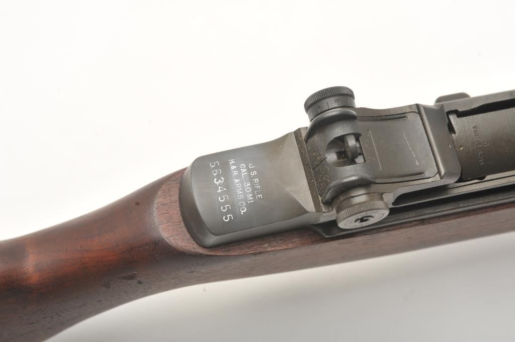 U.S. M1 Garand semi-automatic rifle by H&R Arms Co., .30 caliber, 24” HRA barrel dated 5-55, military finish, wood stock, S/N 5634555; overall fine to excellent condition displaying majority of military finish, fine bore, crisp action, sharp markings and fine wood stock displaying circle P proof and three stars over eagle cartouche on left side of stock. (C&R). Est.: $1,500-$3,000.