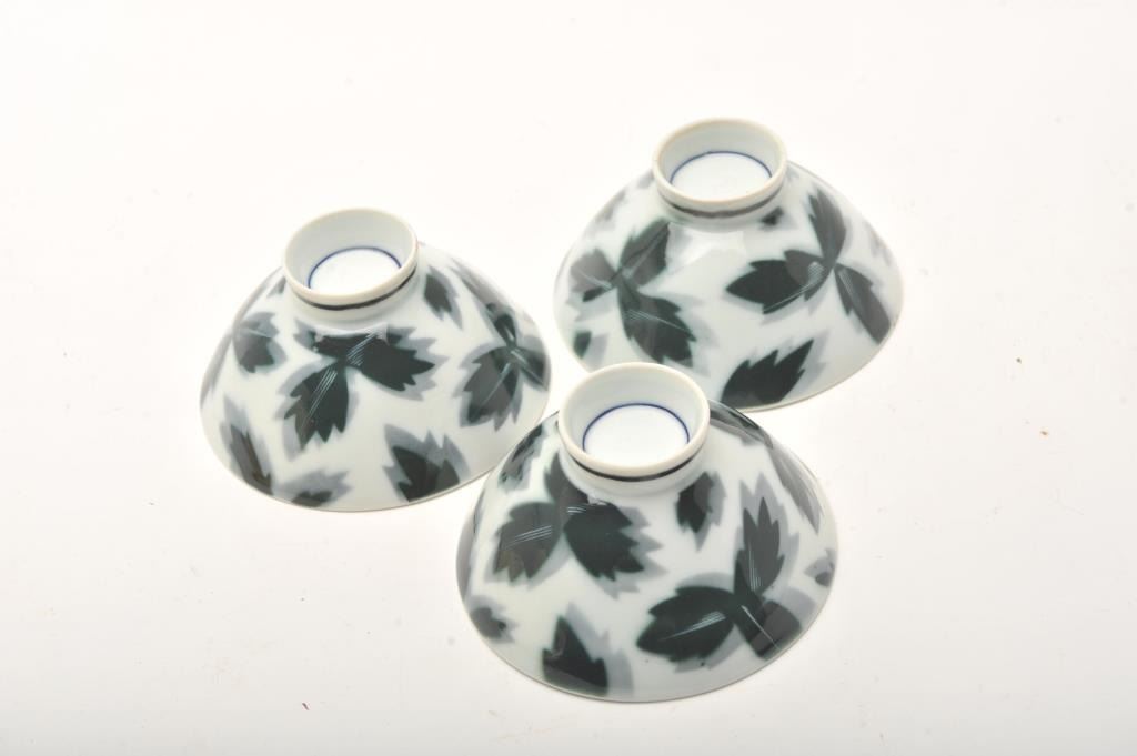 12 matching Japanese small bowls with green leaf and gray shadow decoration. Mold marked. Excellent to mint condition with Japan department store tag. Purchased by U.S. Army Officer Major Cable on duty 1955-1960 in Japan. Est. $100-200