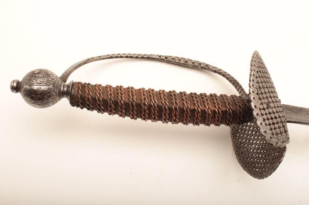 18th century small sword with pierced iron hilt, wire wrapped copper grip and triangular blade. Measures 38 ½” overall with tip reduced. Guard bent and quillon broken off guard. Est.: $300-$600
