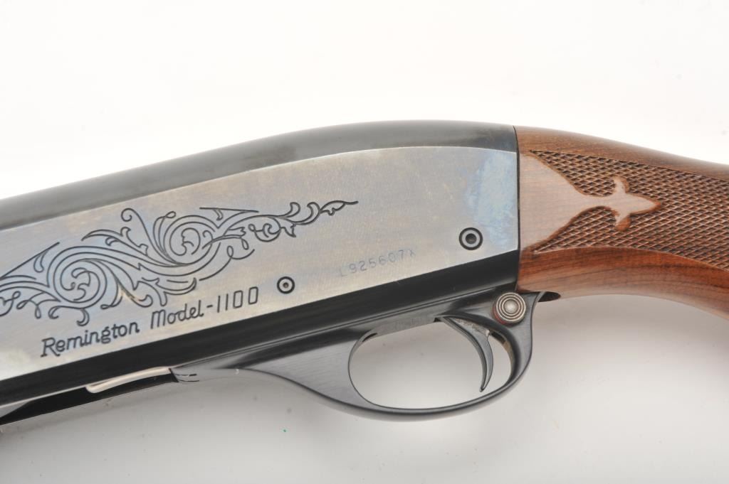 Remington Model 1100, #L925607X, 20 Ga, 28" vent rib barrel chambered for 2 3/4" shells, blued finish, checkered walnut stock, with rubber recoil pad,13” to the end of the wood, 14" LOP. Shotgun is in very good plus condition showing 95% plus original finish, with some slight pin prick pitting starting on the barrel which should clean. Bore is very good, action is good, stocks are very good plus. Full choke. (Modern/PPT) Est. $300-600