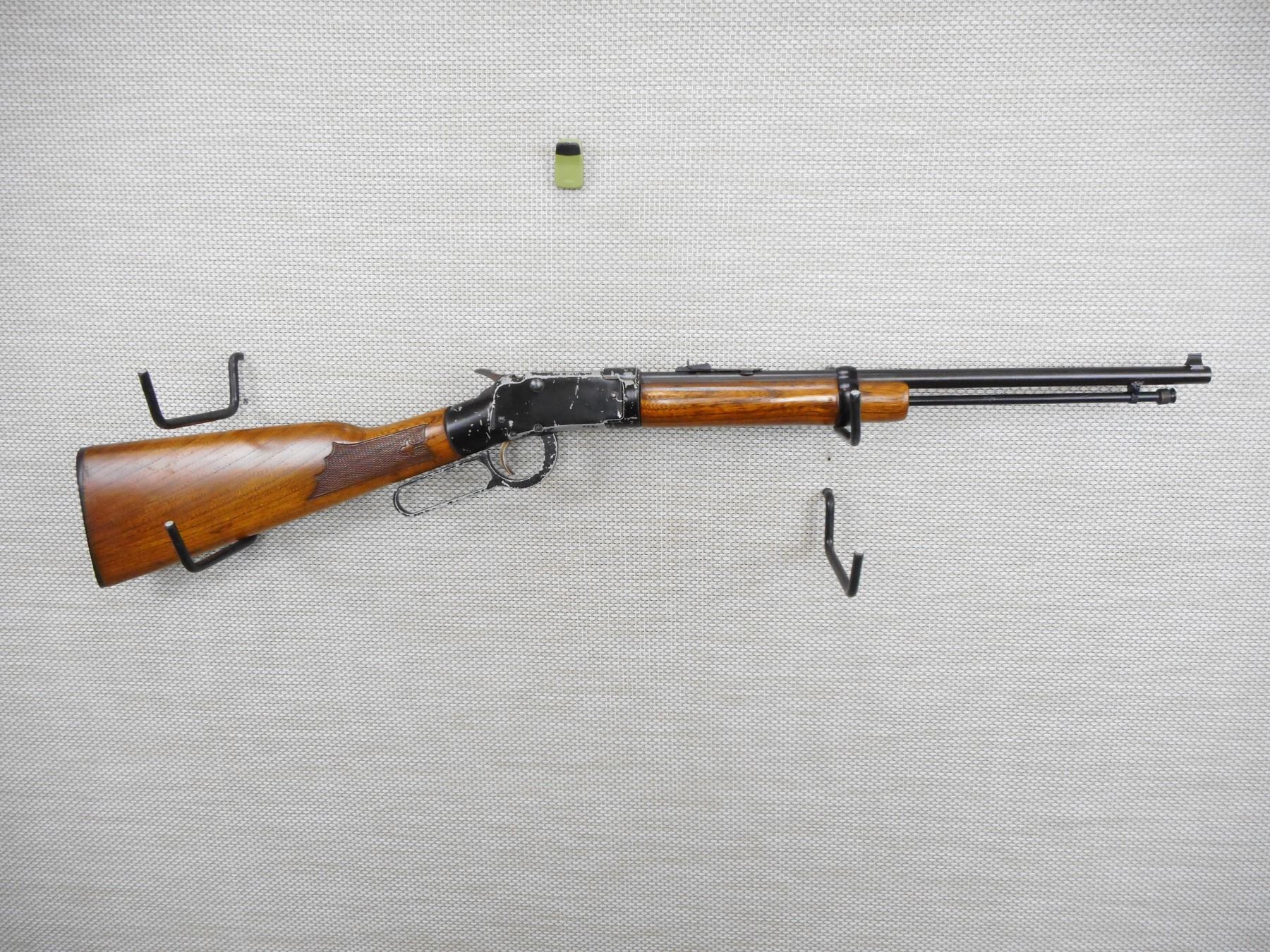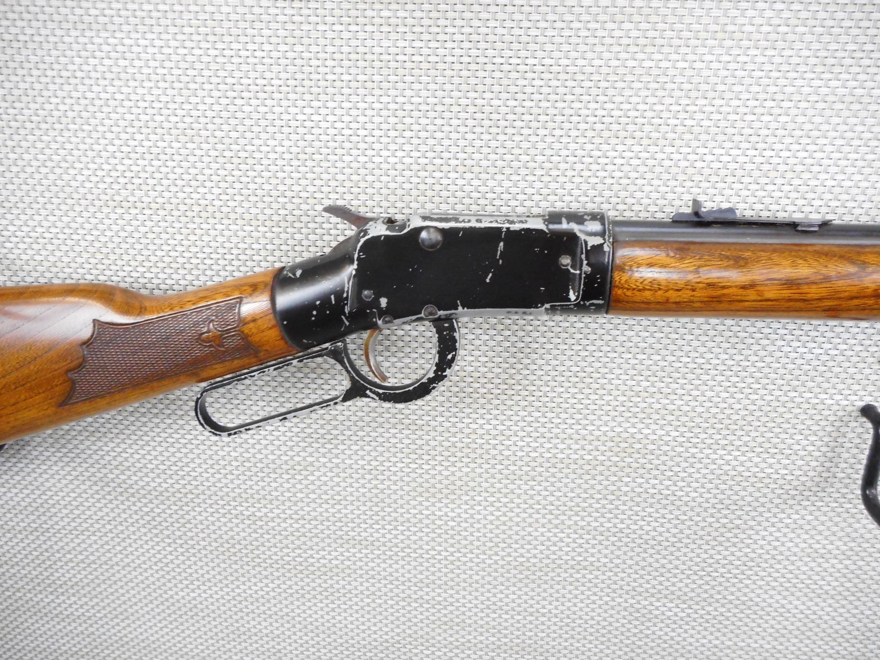 ITHACA , MODEL: M-49 , CALIBER: 22 LR , THIS HAS A DECORATIVE NON FUNCTIONING TUBE MAGAZINE IT IS ACTUALLY A SINGLE SHOT, VERY GOOD BORE, BLADE FRONT AND ADJUSTABLE REAR SIGHT, TWO PIECE HARDWOOD STOCK WITH CHECKERED WRIST, PLASTIC BUTT PLATE, PAINTED RECEIVER SHOWS NUMEROUS CHIPS IN THE PAINT, SHOWS SOME HANDLING MARKS , STOCK # 9872 , SERIAL # 490550696 , ACTION: SINGLE SHOT LEVER ACTION RIFLE , BARREL LENGTH: 18" , CONDITION: 6/10 , CLASS: CLASS: CANADIAN NON RESTRICTED CLASS