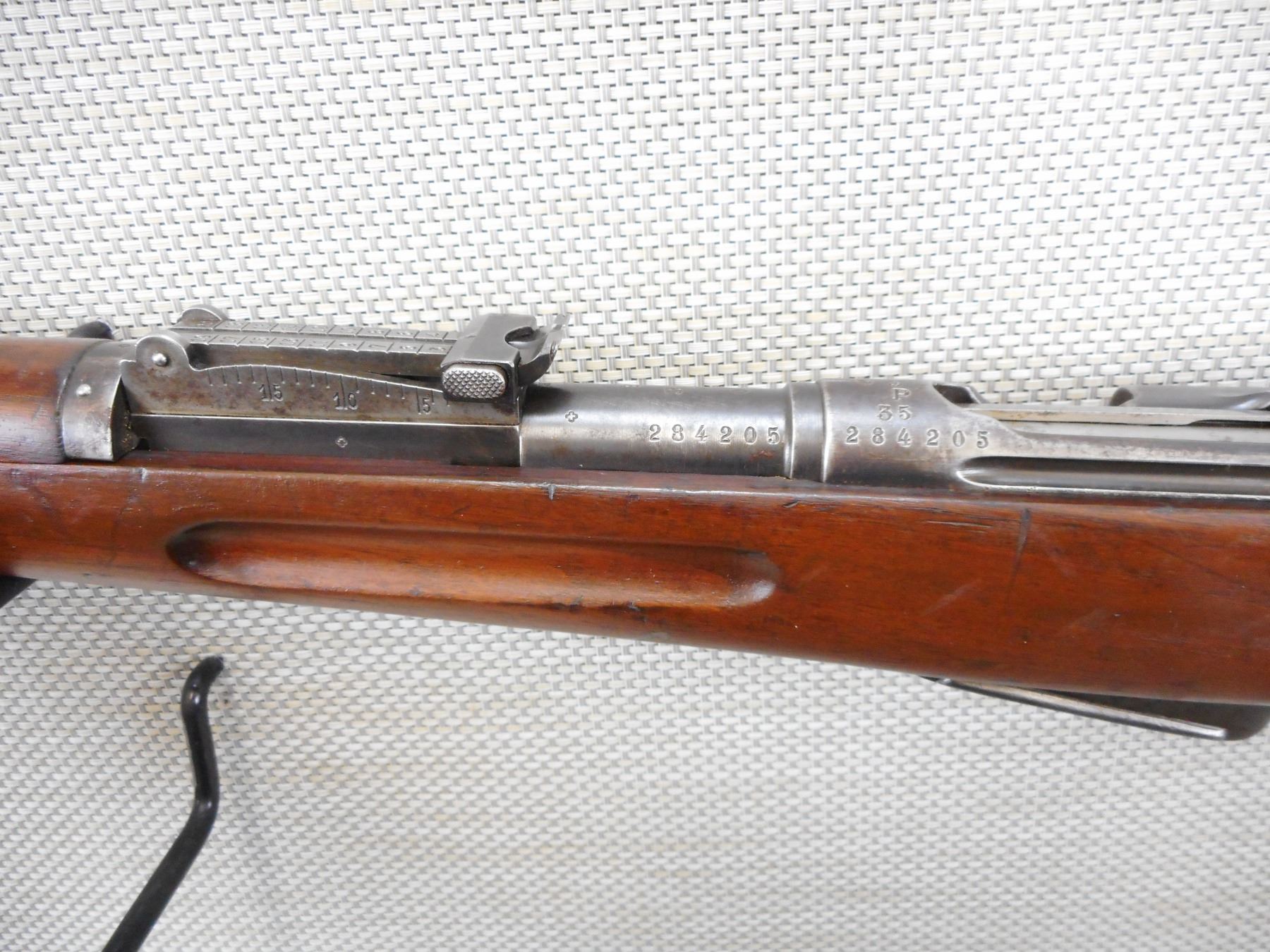 SCHMIDT RUBIN , MODEL: 1896/11 SWISS MILITARY SERVICE RIFLE , CALIBER: 7.5 X 55 , COMES WITH MAGAZINE, STRAIGHT PULL BOLT, GOOD BORE, BLADE FRONT SIGHT AND ADJUSTABLE REAR SIGHT, RETAINS FULL MILITARY CONFIGURATION, SLING SWIVEL LOOPS, STEEL BUTT PLATE, ARESENAL ADDED SEMI PISTOL GRIP, STACKING ROD AND BAYONET LUG PRESENT, SHOWS VERY LITTLE HANDLING MARKS , STOCK # 10037 , SERIAL # 284205 , ACTION: BOLT ACTION RIFLE , BARREL LENGTH: 30" , CONDITION: 6/10 , CLASS: CLASS: CANADIAN NON RESTRICTED CLASS