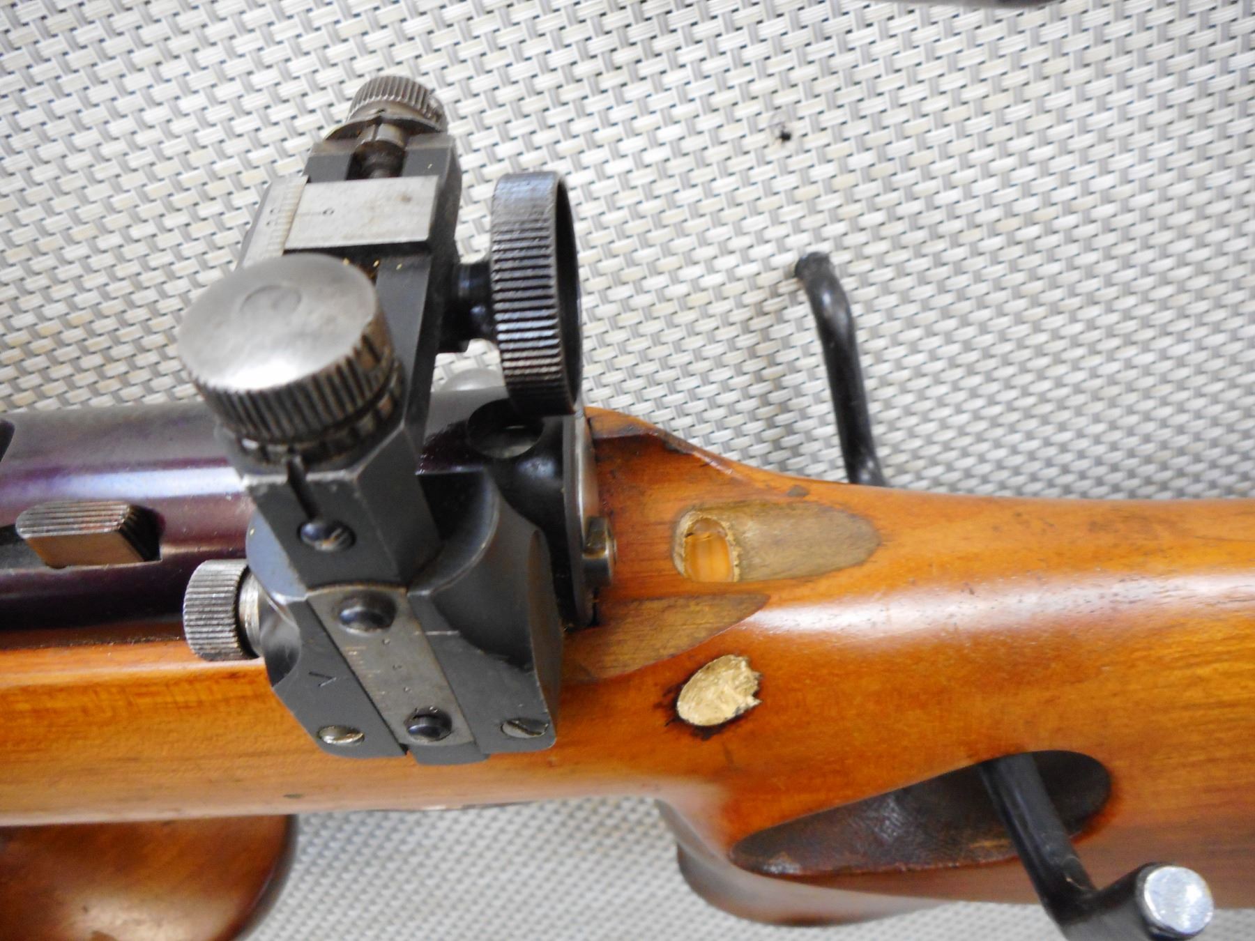 SCHULTZ & LARSEN , MODEL: MATCH RIFLE , CALIBER: 6.5R IS STAMPED ON THE BARREL AS CALIBER , BOLT AND RECEIVER ARE MATCHING BY SERIAL #, BORE IS VERY GOOD, HOODED ADJUSTABLE FRONT SIGHT AND REAR PEEP SIGHT, ADJUSTABLE SET TRIGGERS, COMPETITION THUMB HOLE STOCK WITH VERTICAL PISTOL GRIP AND FRONT HAND REST, INLEDDED SPIRIT LEVEL AT WRIST, SHUTZEN BUTT PLATE, SLING LOOP MISSING THE REAR SLING LOOP, SHOWS SOME HANLDING MARKS , STOCK # 10042 , SERIAL # 1408 , ACTION: BOLT ACTION RIFLE , BARREL LENGTH: 28" , CONDITION: 6/10 , CLASS: CLASS: CANADIAN NON RESTRICTED CLASS