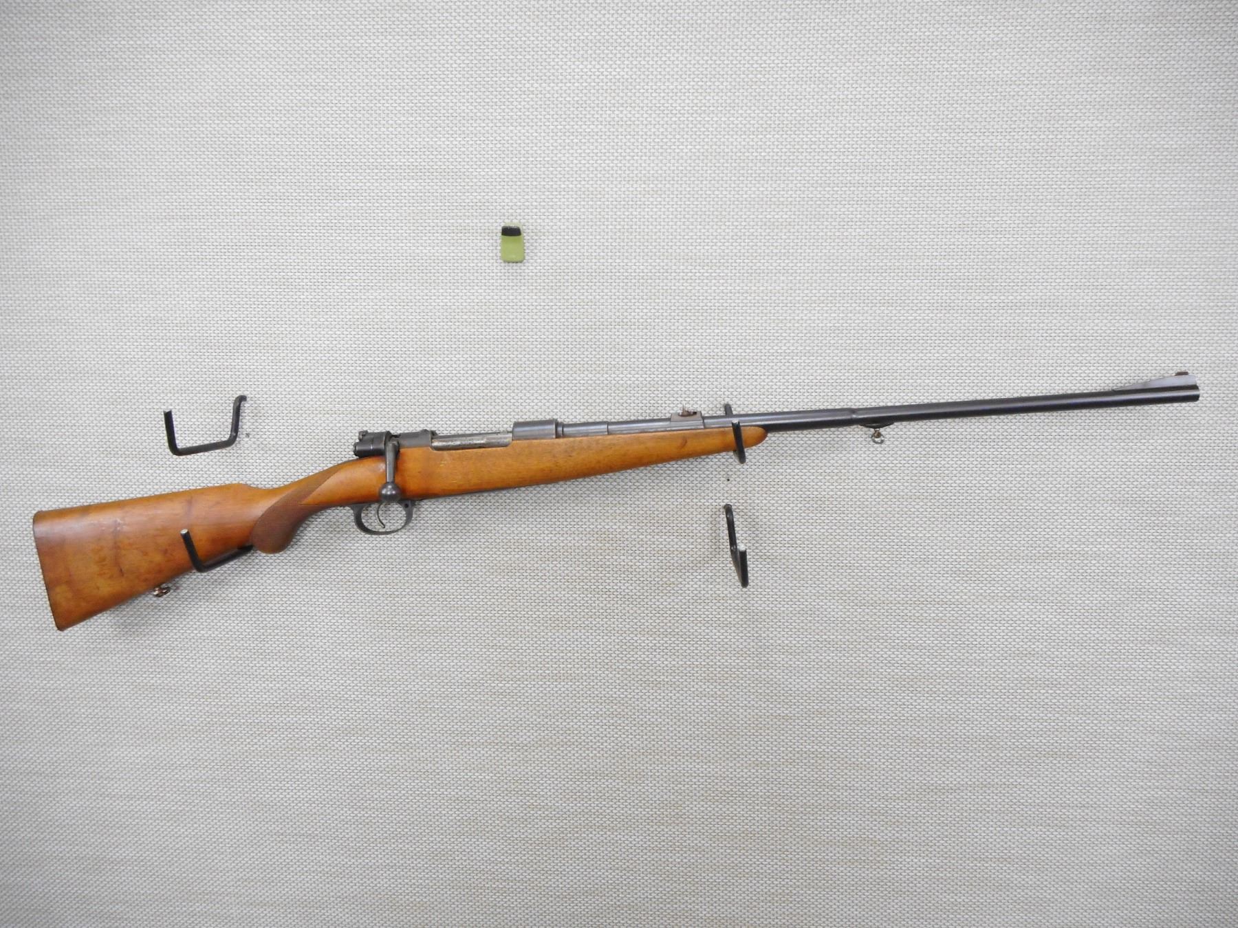 MAUSER , MODEL: M98 , CALIBER: 8 X 57 , ALL MARKINGS APPEAR TO HAVE BEEN REMOVED, BORE IS GOOD, RAMP FRONT AND ADJUSTABLE REAR SIGHTS, ONE PIECE HARDWOOD STOCK WITH CHECKERED SEMI PISTOL GRIP, STEEL BUTT PLATE, SLING SWIVEL LOOPS, TURN DOWN BOLT THAT HAS BEEN WELDED, SHOWS SOME HANDLING MARKS , STOCK # 10062 , SERIAL # N/A , ACTION: BOLT ACTION RIFLE , BARREL LENGTH: 24" , CONDITION: 5/10 , CLASS: CLASS: CANADIAN NON RESTRICTED CLASS
