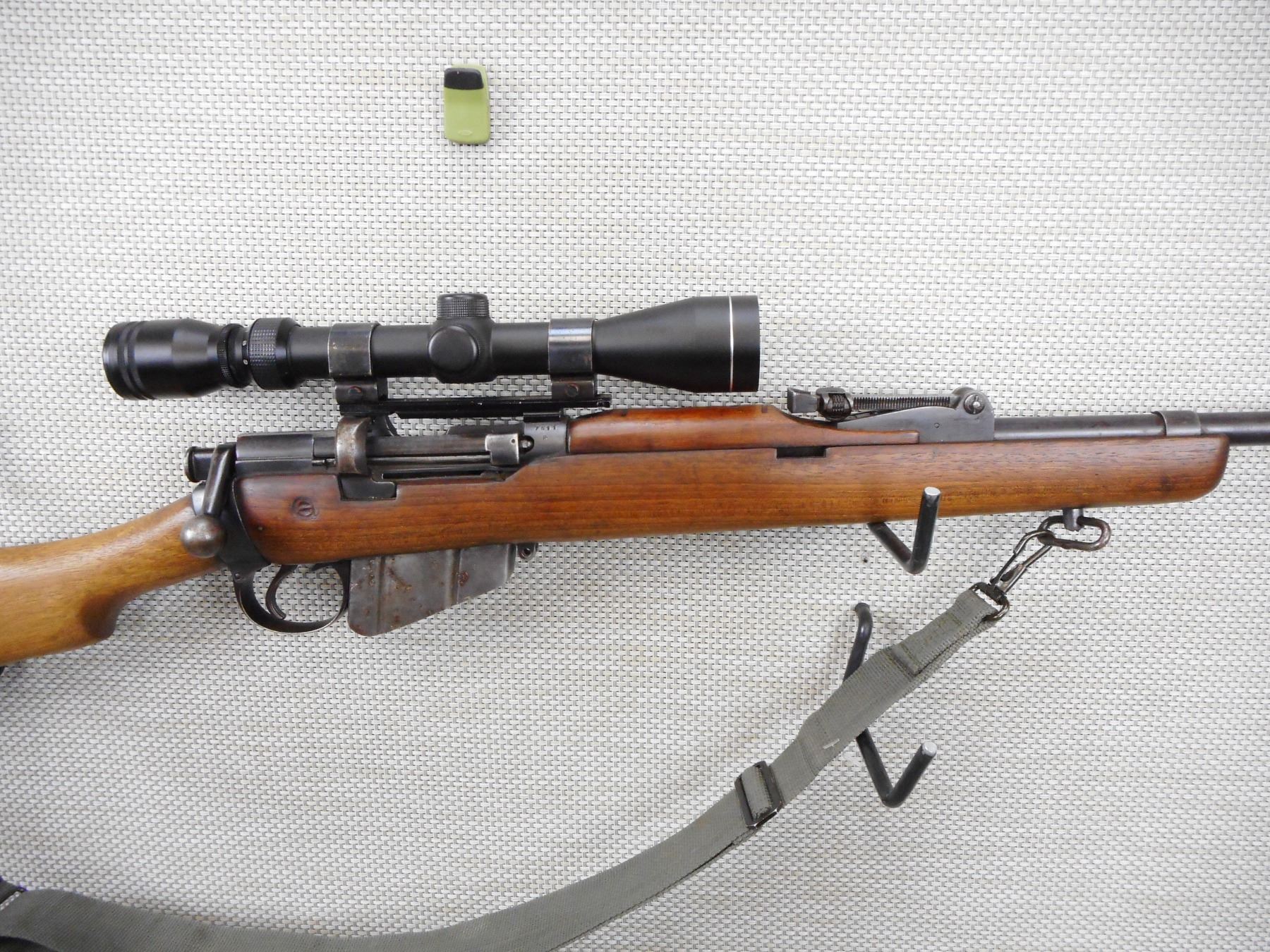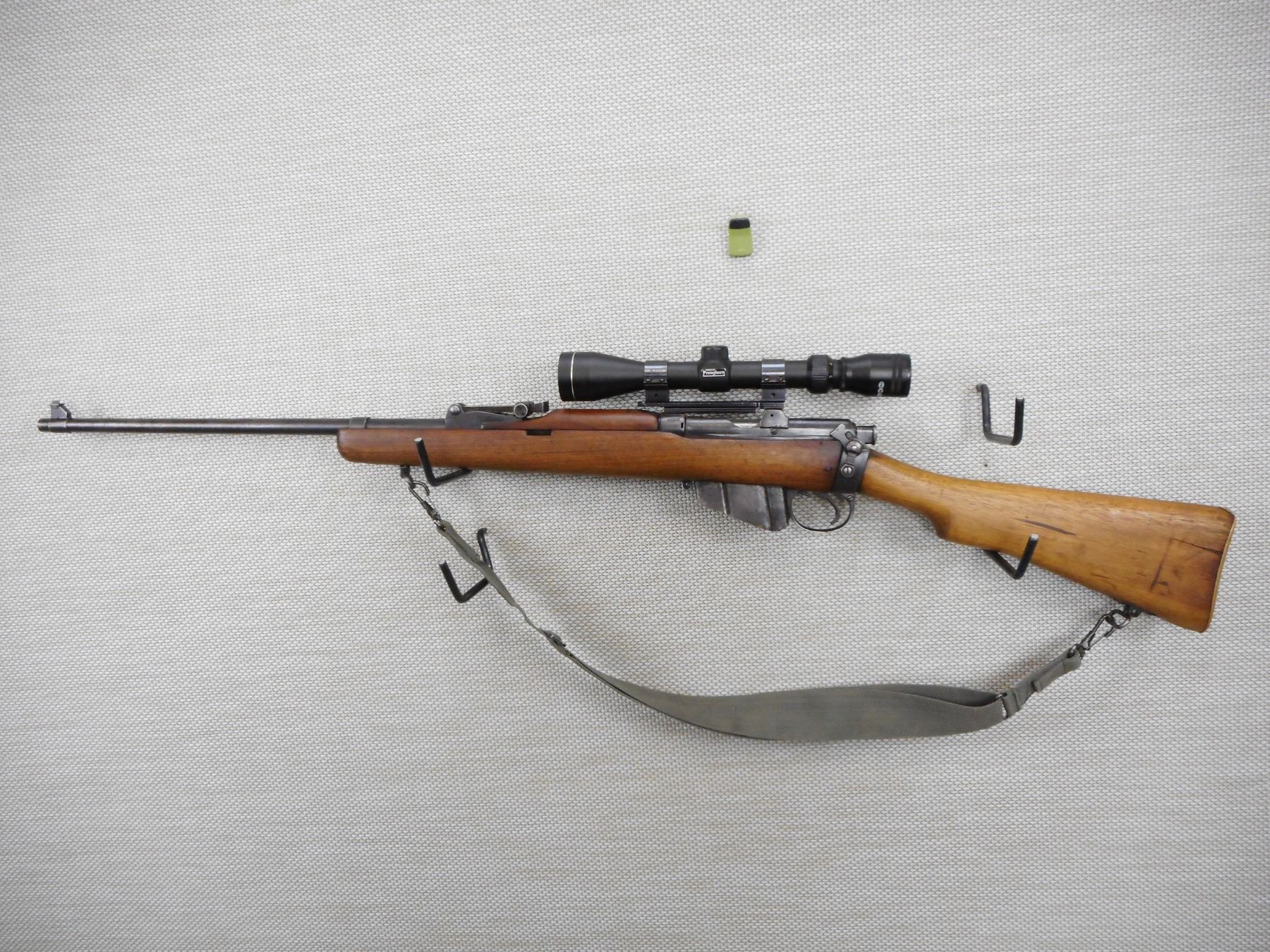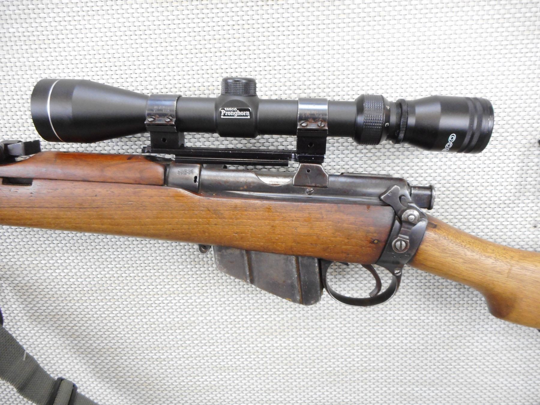 LEE ENFIELD , MODEL: NO1 MKIII SPORTER , CALIBER: 303 BR , COMES WITH MAGAZINE, BORE IS FAIR, BOLT AND RECEIVER ARE MATCHING BY SERIAL #, TASCO 3 - 9 VARIABLE SCOPE, SLING SWIVEL LOOPS WITH CANVAS SLING, BRASS BUTT PLATE, SHOWS SOME HANDLING MARKS , STOCK # 10133 , SERIAL # 7511R , ACTION: BOLT ACTION RIFLE , BARREL LENGTH: 25" , CONDITION: 6/10 , CLASS: CLASS: CANADIAN NON RESTRICTED CLASS