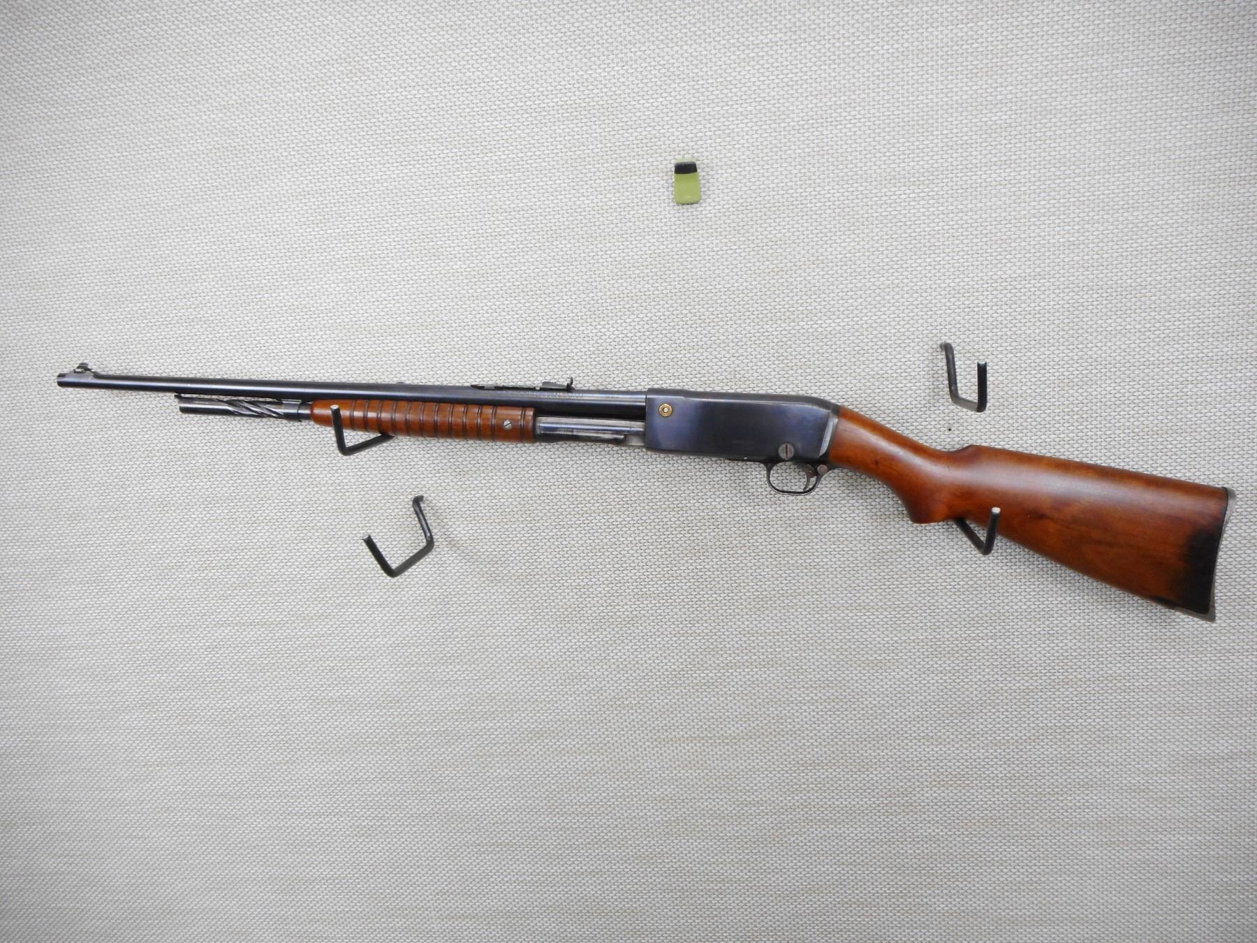 REMINGTON , MODEL: 14 , CALIBER: 30 REM , EXCELLENT BORE, BLADE FRONT AND ADJUSTABLE REAR SIGHT, TWO PIECE HARDWOOD STOCK WITH STEEL BUTT PLATE, OIL STAINED BASE OF THE BUTT STOCK, SHOWS SOME HANLDING MARKS , STOCK # 10148 , SERIAL # 100083 , ACTION: PUMP ACTION RIFLE , BARREL LENGTH: 22" , CONDITION: 6/10 , CLASS: CLASS: CANADIAN NON RESTRICTED CLASS